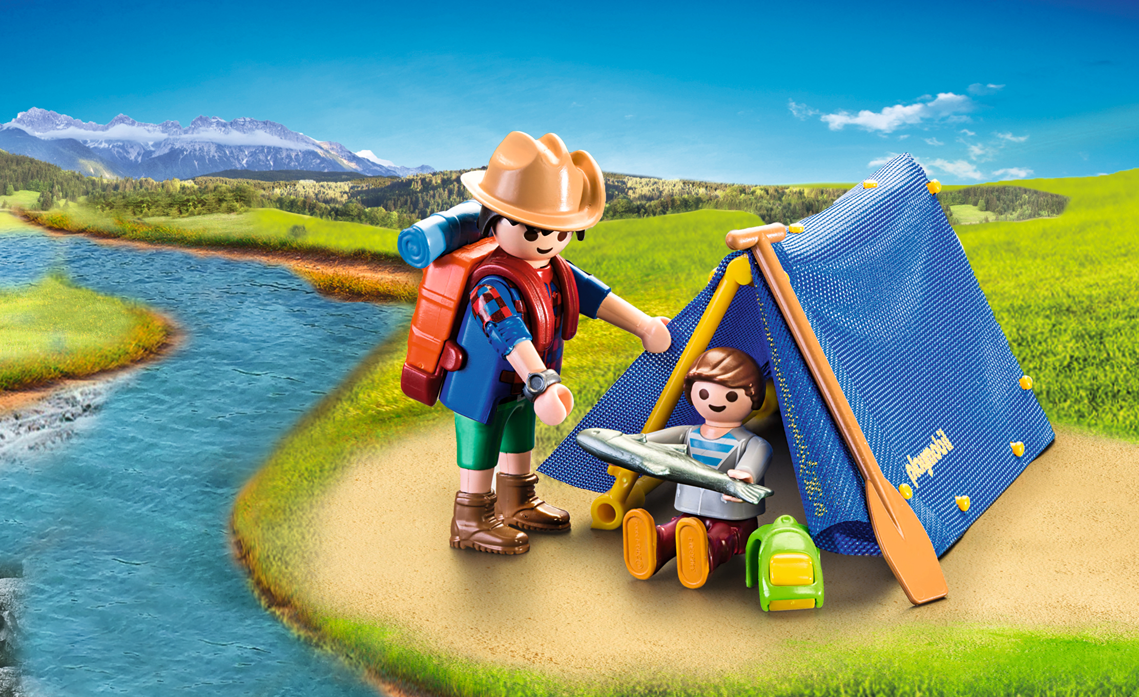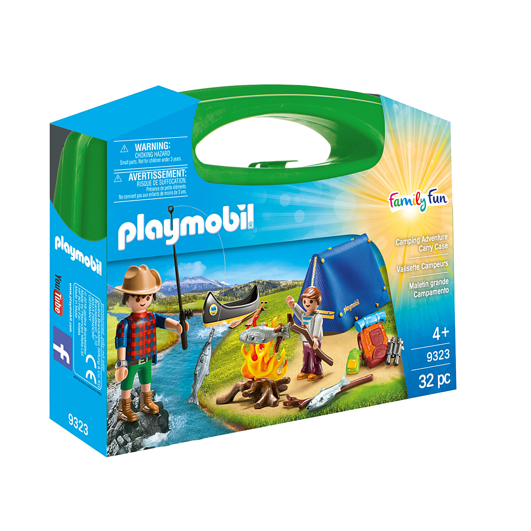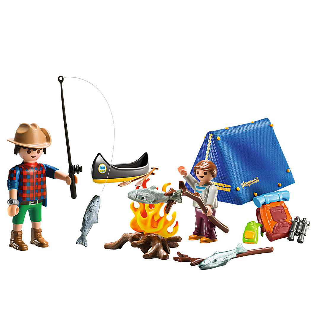 Maman, on peut aller pêcher s'il te plaît ? Valisette avec deux personnages, un bateau, deux poissons, une tente, une canne à pêche et des accessoires.
