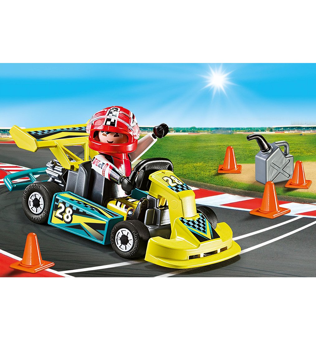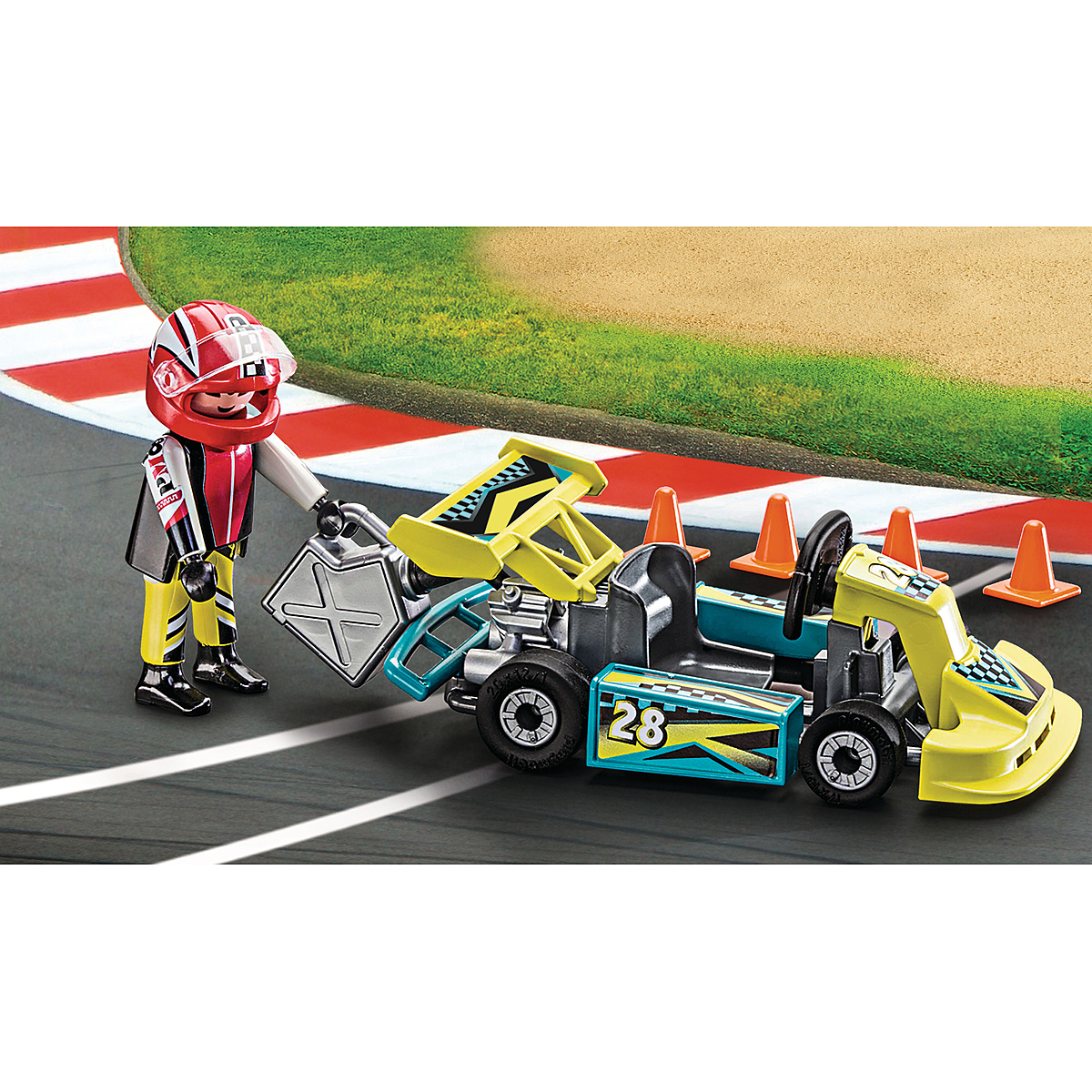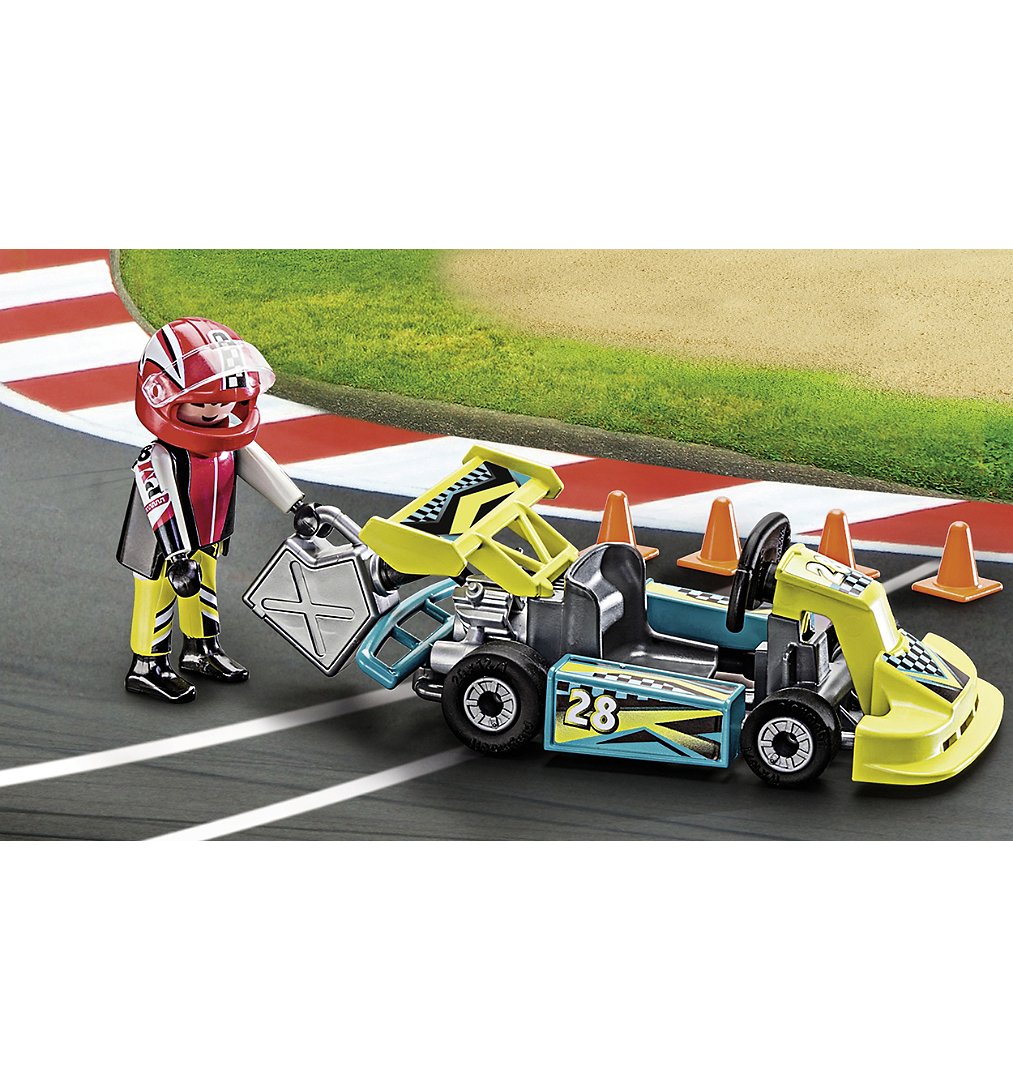 Contient 1 personnage, 1 voiture de course et des accessoires