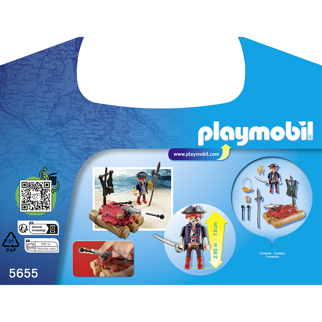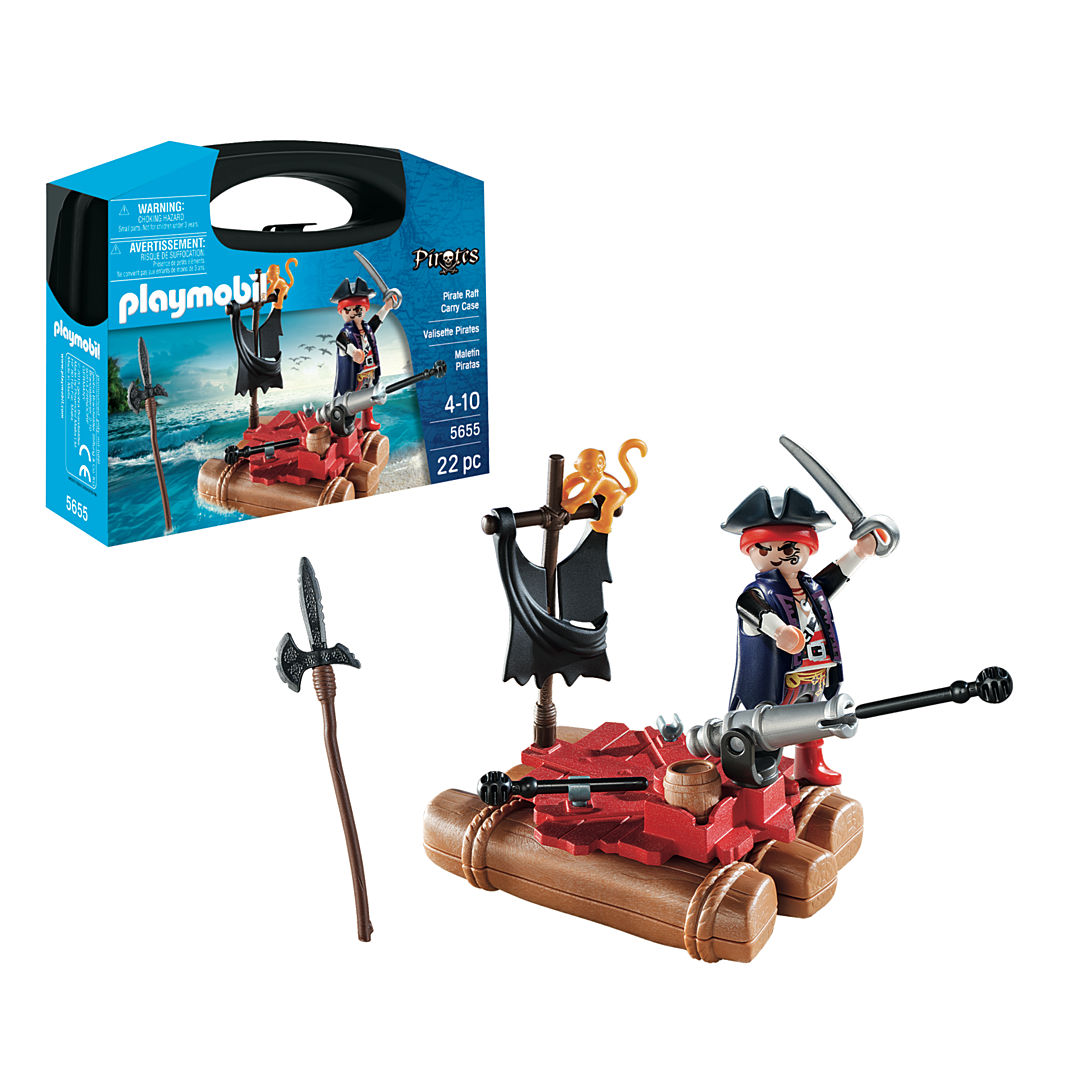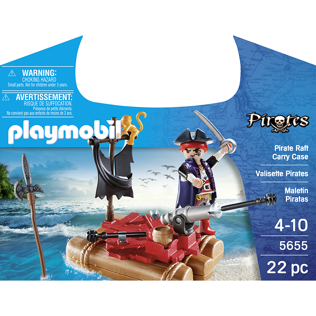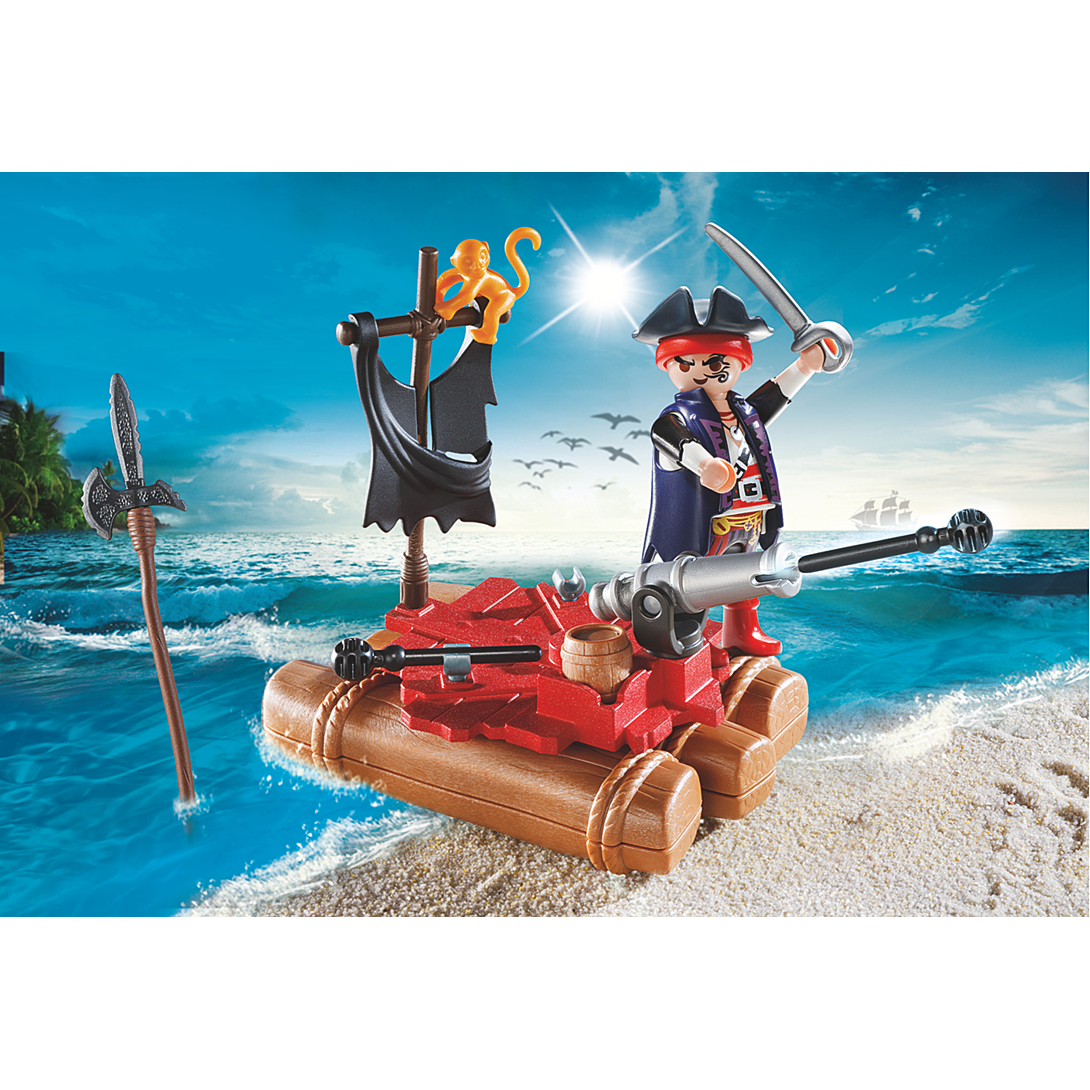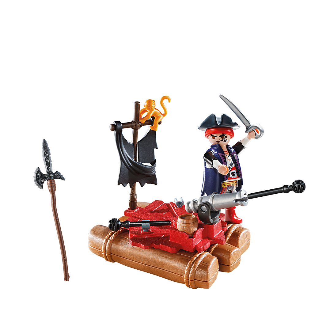 Contient un personnage, un radeau de pirate et plusieurs accessoires : épées, canon