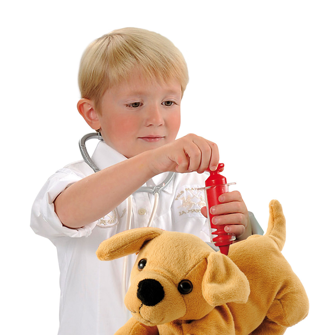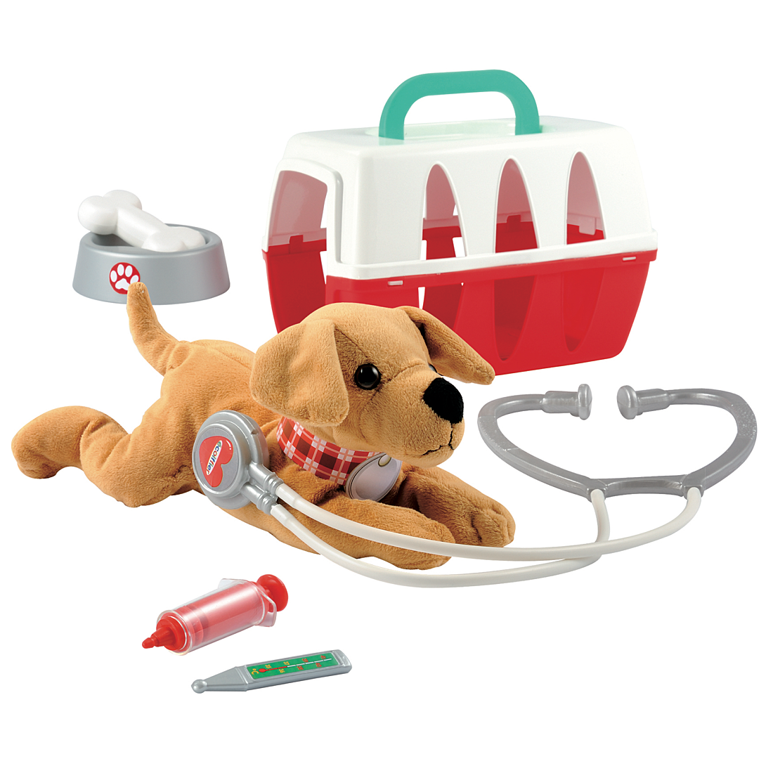 | La boîte contient | Un joli petit chien en peluche dans sa valisette de transport avec une écuelle, un os, un stéthoscope, un thermomètre et une seringue. Dès 18 mois. Fabrication Française. |