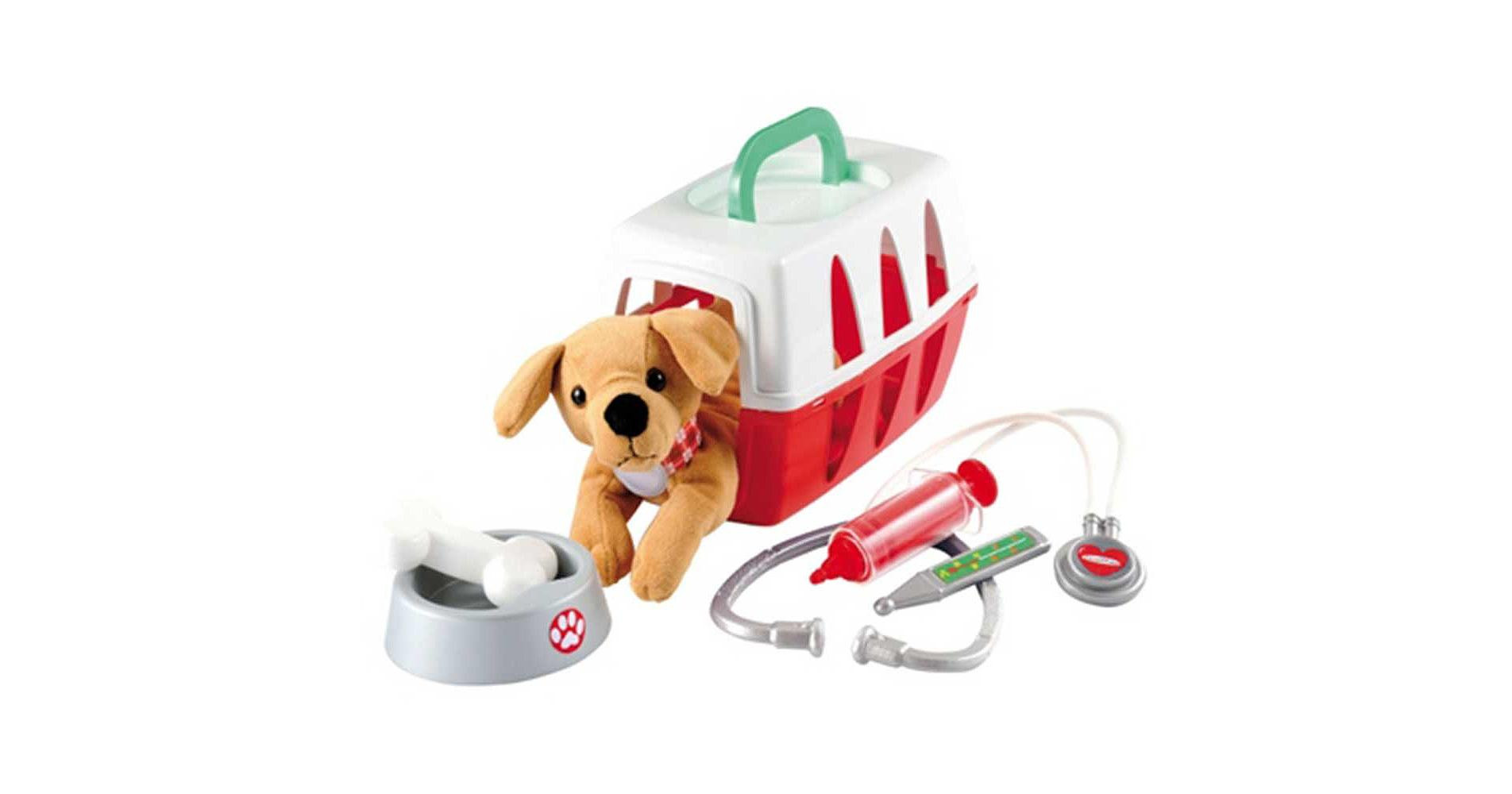 Un joli petit chien en peluche dans sa valisette de transport avec une écuelle, un os, un stéthoscope, un thermomètre et une seringue. Dès 18 mois. Fabrication Française.