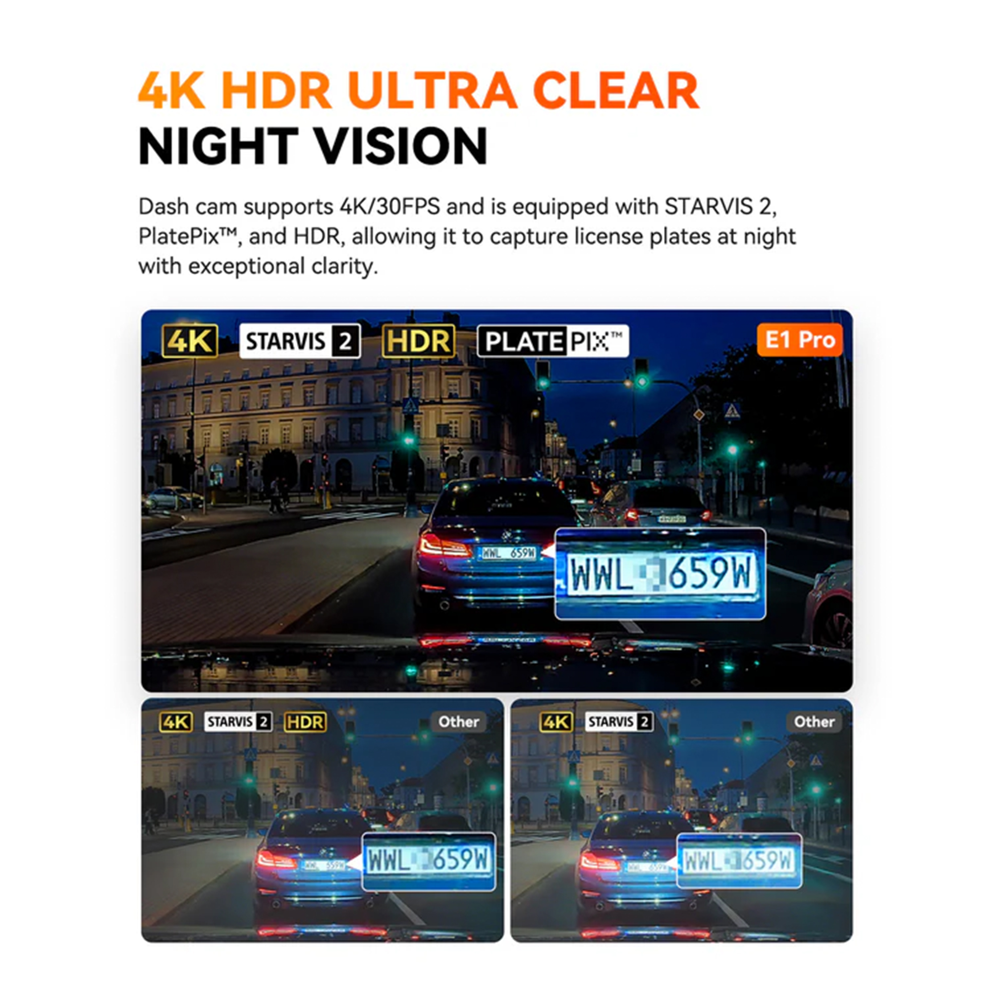 Ce dashcam intègre le logiciel avancé PlatePix, qui fournit un HDR 4K évolutif et 50 % plus lumineux qu'un HDR 4K standard. Grâce à la combinaison de PlatePix, STARVIS 2 et de l'objectif à 6 lentilles F1.8, le dashcam réduit le flou de mouvement et améliore la reconnaissance des plaques d'immatriculation. Des tests indiquent que l'E1 Pro peut capturer efficacement les plaques d'immatriculation, même de nuit, à des vitesses allant jusqu'à 50 km/h. Parfait pour les voitures familiales, les nouveaux conducteurs et les chauffeurs Uber/Lyft !