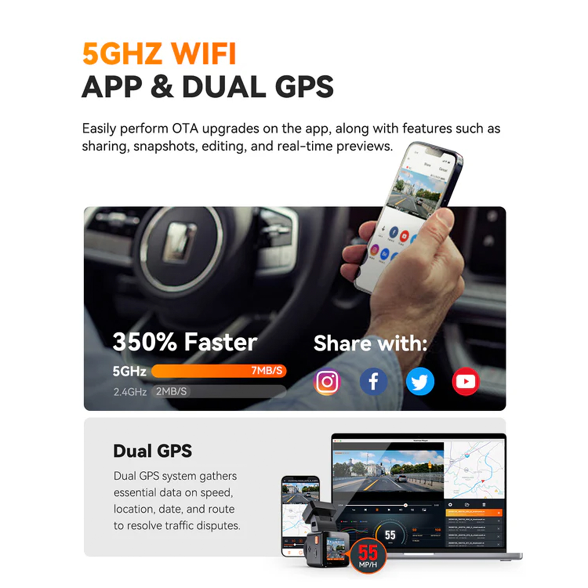 Connectez-vous sans effort à l'application VANTRUE pour télécharger, éditer et partager les vidéos du dashcam à une vitesse de 7 Mo par seconde. Le GPS intégré du dashcam VANTRUE E1 Pro assure un suivi précis de votre position, de votre vitesse de conduite et de votre itinéraire, le tout visualisable sur votre smartphone ou ordinateur. Avec des fonctions de contrôle vocal intuitives, vous pouvez facilement commander votre dashcam sans détourner votre attention de la route.
