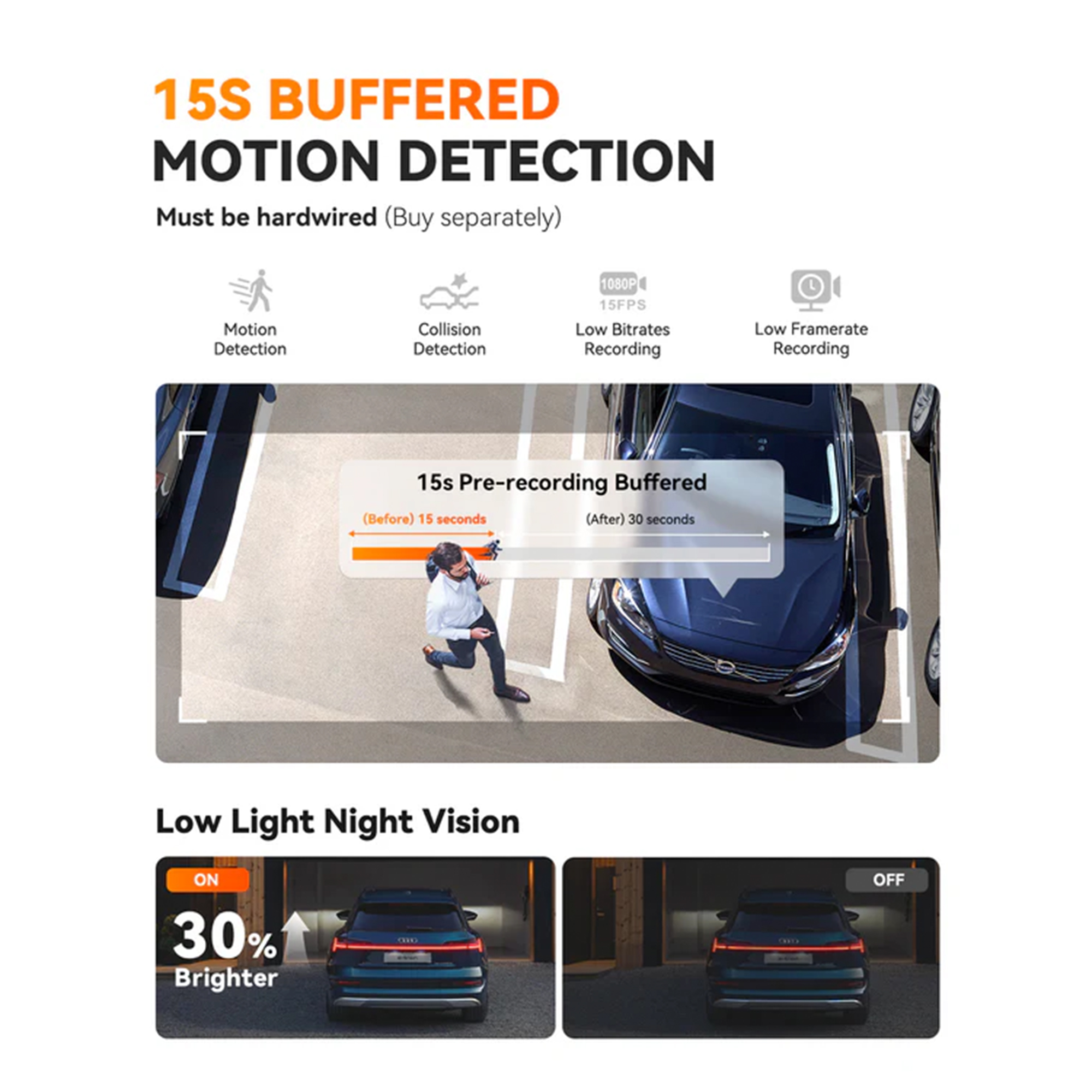 Équipé d'une détection de mouvement tamponnée, le dashcam Vantrue E1 Pro enregistre 15 secondes avant et 30 secondes après la détection d'un mouvement. La technologie de vision nocturne Starlight améliore la clarté et la netteté des vidéos en mode stationnement de 30%, garantissant une capture détaillée. Choisissez parmi différents modes de stationnement tels que la détection de mouvement, la détection de collision, le mode faible débit binaire ou le mode faible fréquence d'images pour une protection complète des événements.