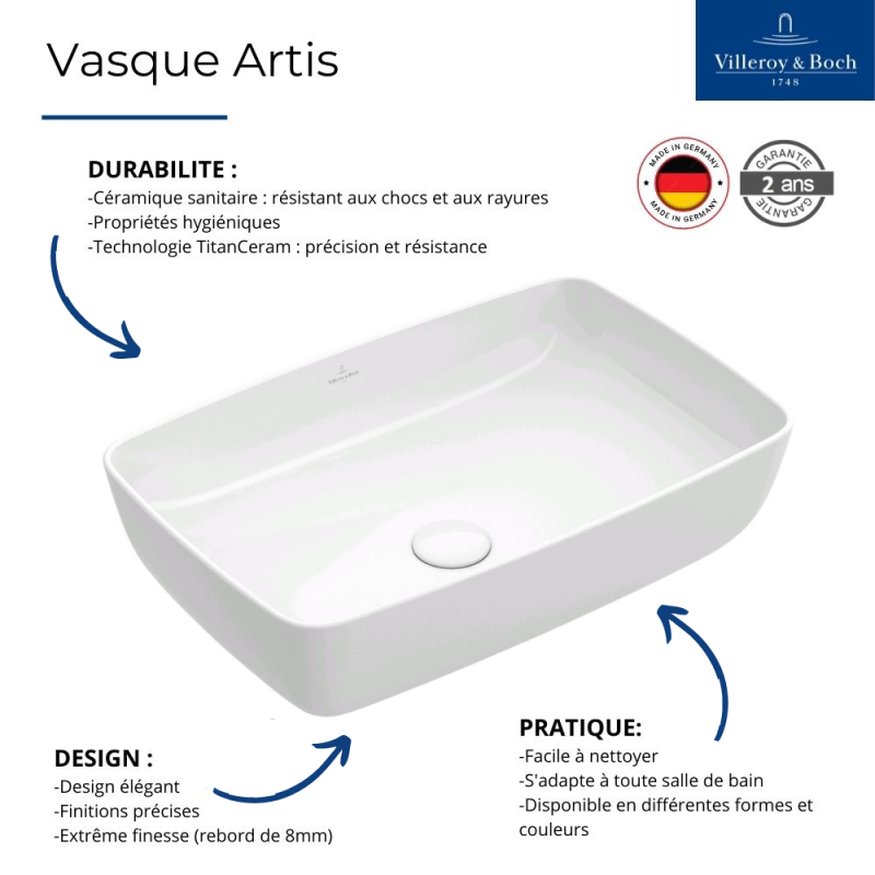 | Libellé | Vasque rectangle à poser VILLEROY ET BOCH Artis Blanc |