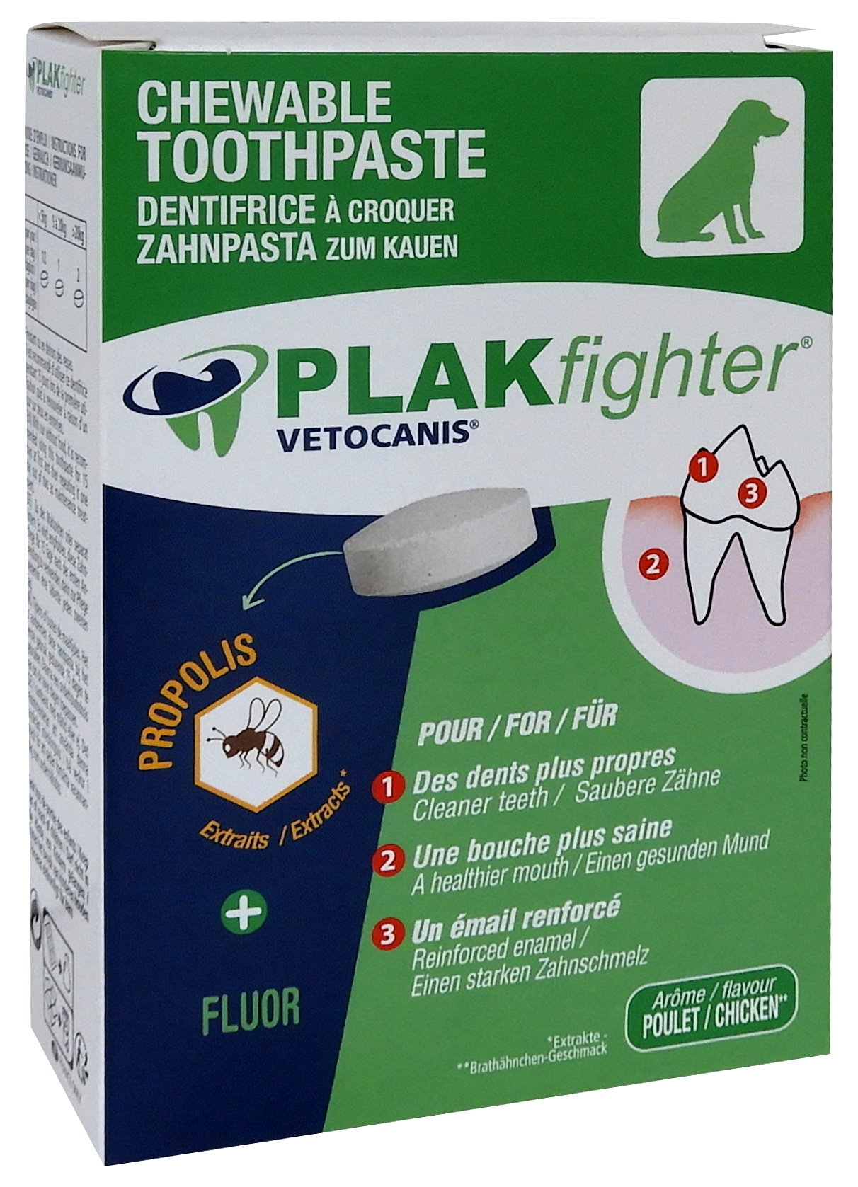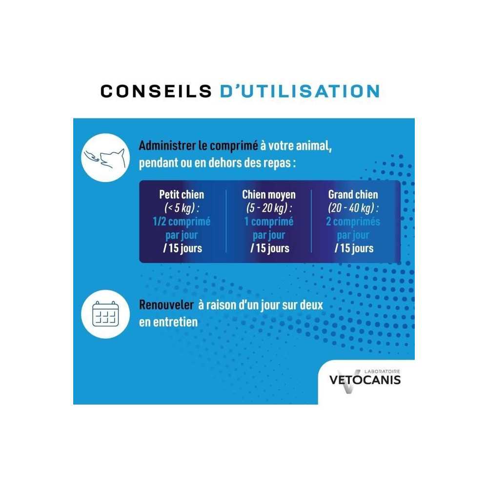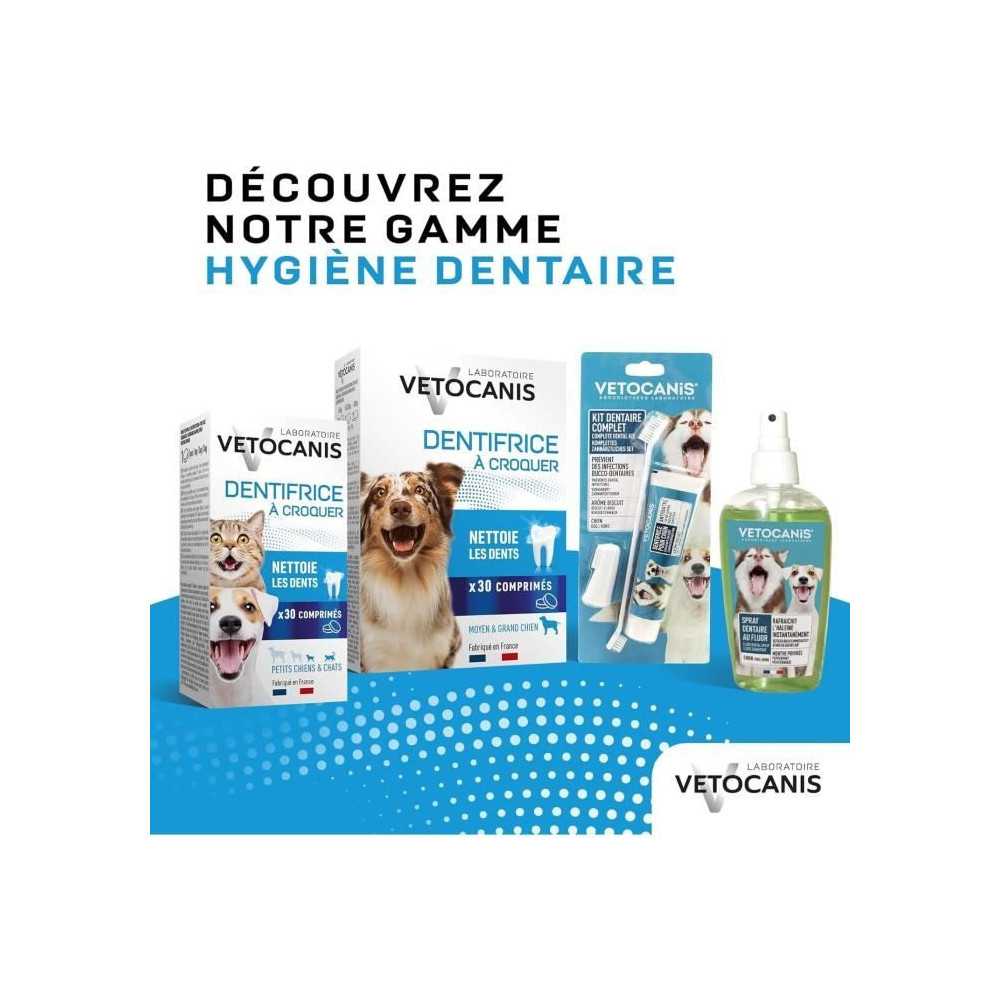 Complément alimentaire pour chien. En préventif ou en curatif, le Dentifrice à croquer vetocanis pour chien apporte une triple action : anti tartre : en croquant le comprimé, votre chien génère un frottement sur la surface des dents ce qui contribue ainsi à éliminer le tartre. Renforce les défenses Immunitaires grâce à l'action de la propolis. RENFORCE l'émail grâce au fluor qu'elle contient et contribue à protéger les dents contre les caries. Arôme poulet ultra appétent facile à administrer. Boîte de 30 comprimés / poids net 48g. Conseils: Chiens - de 5kg : 1/2 comprimé / jour. 5 à 20kg : 1 comprimé / jour. 20kg et plus : 2 comprimés/ jour pendant ou en dehors des repas. Il est recommandé d'utiliser pendant 15 jours lors de la première utilisation puis un jour sur deux en entretien. Composition: Sucrose, Levures, Fructose, Minéraux, Glyceryl behenate, Arôme poulet, Propolis.