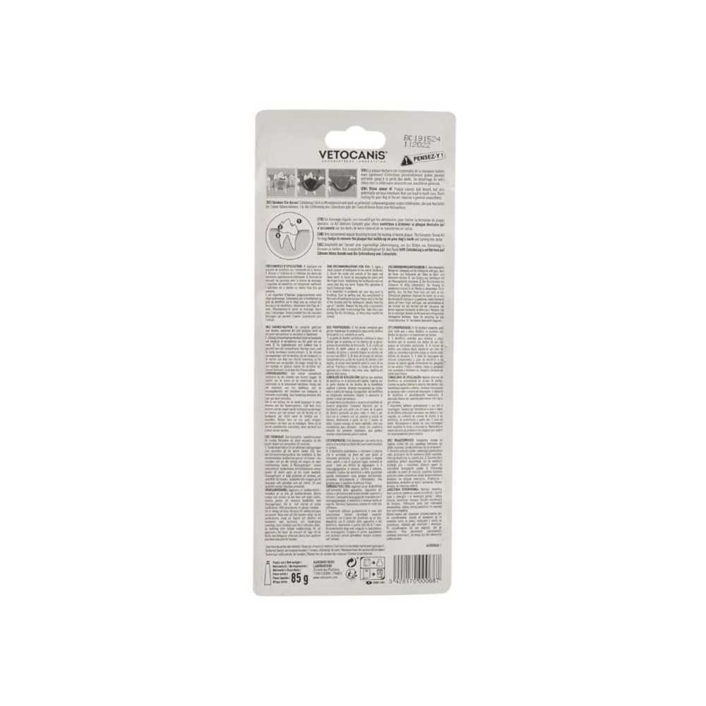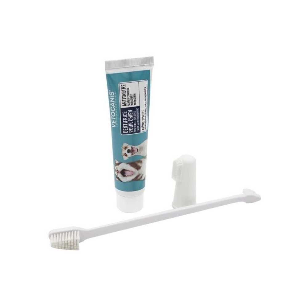 Le kit hygiène dentaire pour chien VETOCANIS évite à la plaque de s'accumuler sur les dents de votre chien et de se transformer en tartre. Il se compose : 1) un dentifrice microabrasif qui nettoie les dents et rafraîchit l'haleine . 2) une brosse à dent à poils souples avec un manche long et une double-tête adaptée à tous types de chien et permettant de nettoyer toutes les dents même les plus difficiles à atteindre. 3) un doigt en silicone pour le nettoyage des dents et des gencives. La plaque dentaire est responsable de la mauvaise haleine mais également d'infections potentiellement graves pouvant entraîner jusqu'à la perte des dents. Un détartrage de votre chien chez le vétérinaire nécessite une anesthésie générale. C'est pourquoi un brossage régulier est conseillé par les vétérinaires pour limiter la formation de plaque dentaire.