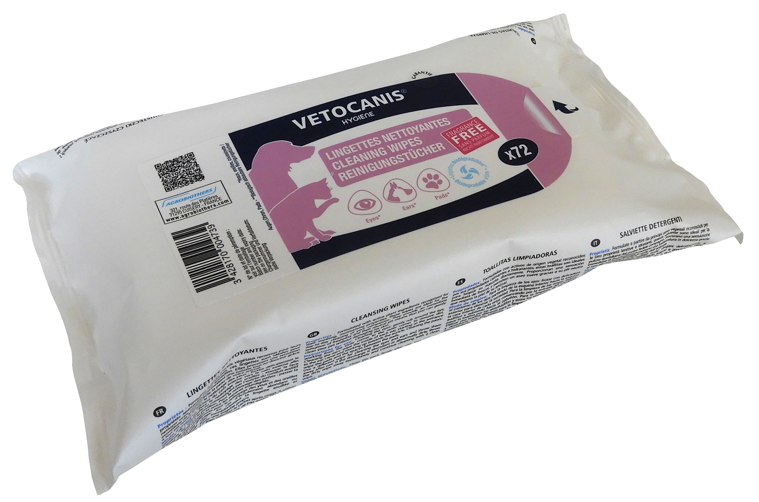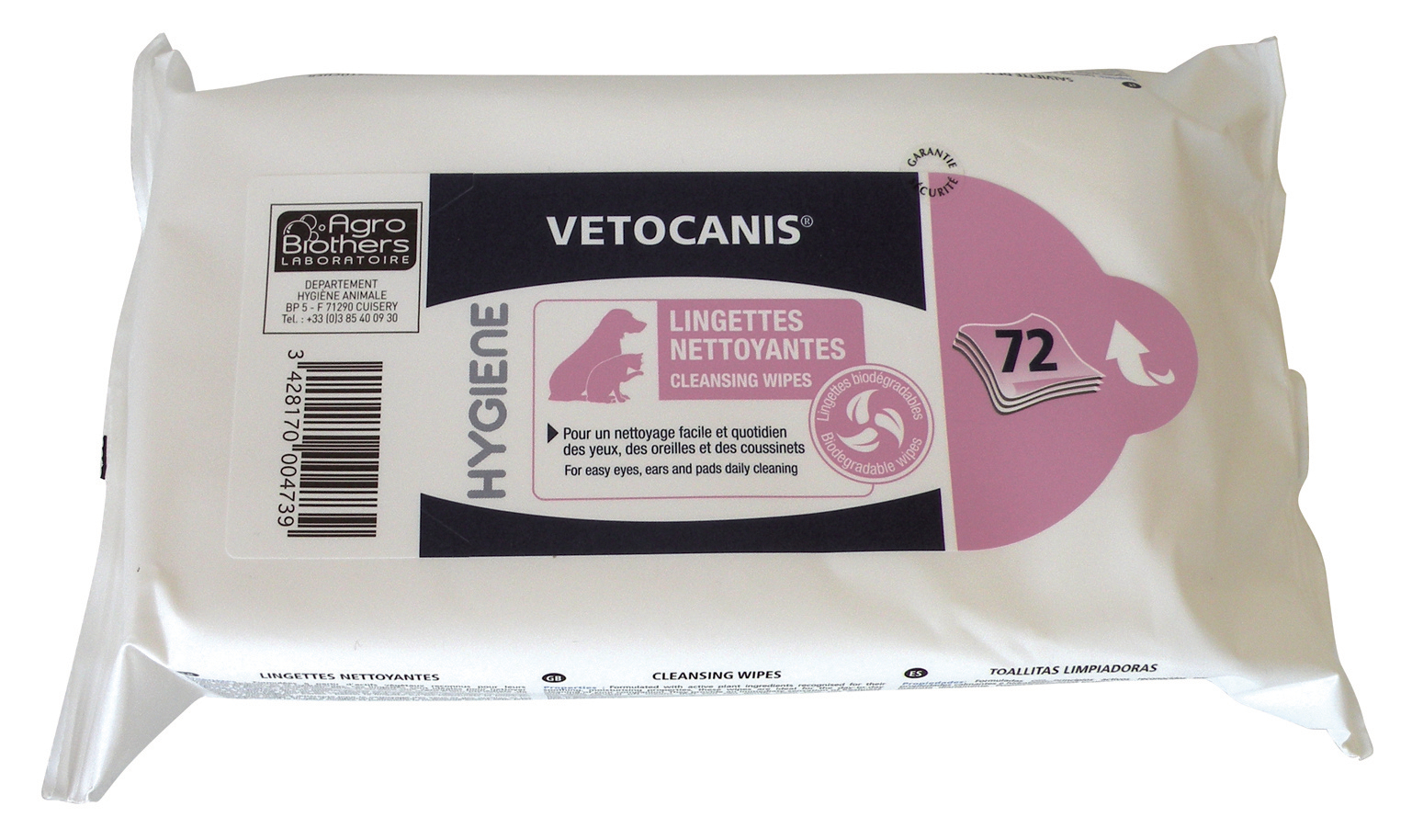 Ces lingettes nettoyantes Vétocanis, sont biodégradables et permettent un nettoyage facile et quotidien des yeux, des oreilles et des coussinets de votre chien et de votre chat. Formulées à partir d'actifs végétaux reconnus pour leurs propriétés apaisantes et hydratantes, ces lingettes sont idéales pour nettoyer votre compagnon au quotidien. Elles procurent une sensation immédiate de fraîcheur, et permettent une toilette tout en douceur grâce à leur ph neutre qui respecte la peau de votre animal. Grand format, avec 72 lingettes.