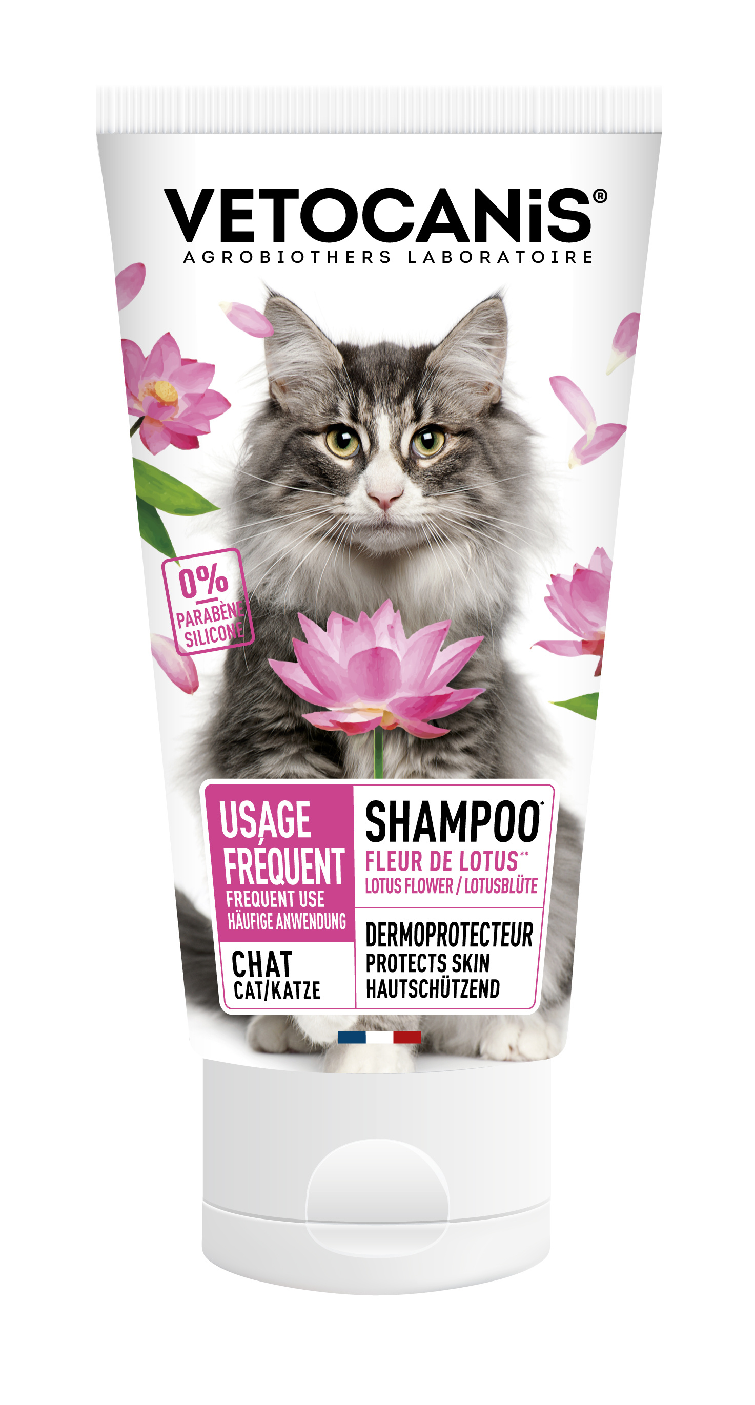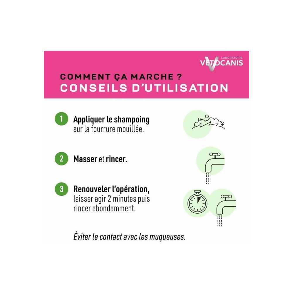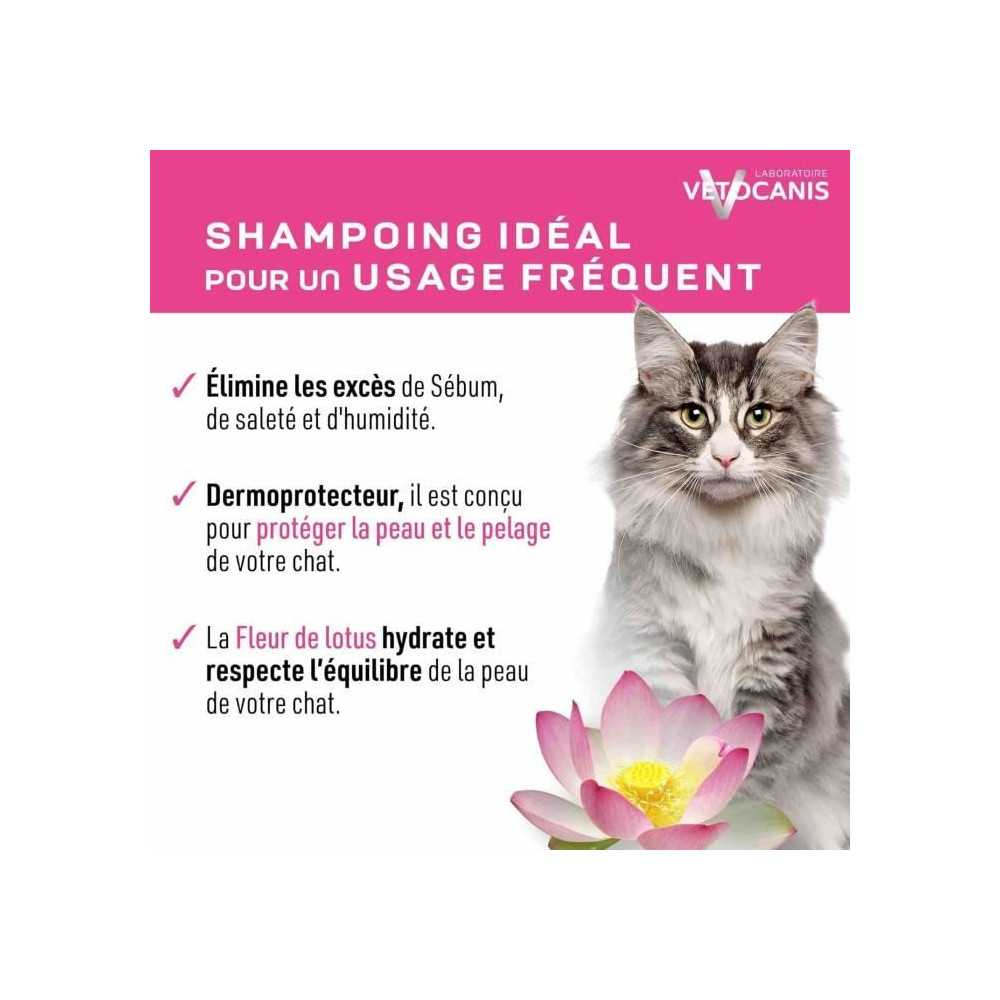 | Plus produit | Formulé sous contrôle vétérinaire, sans paraben ni silicone, à base de glycérine végétale et extrait de fleur de lotus pour hydrater, respecter l'équilibre cutané et apporter douceur, souplesse et brillance au pelage. |