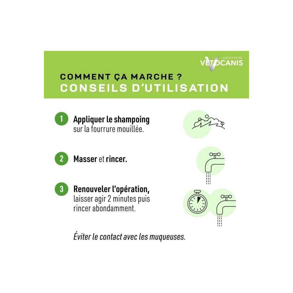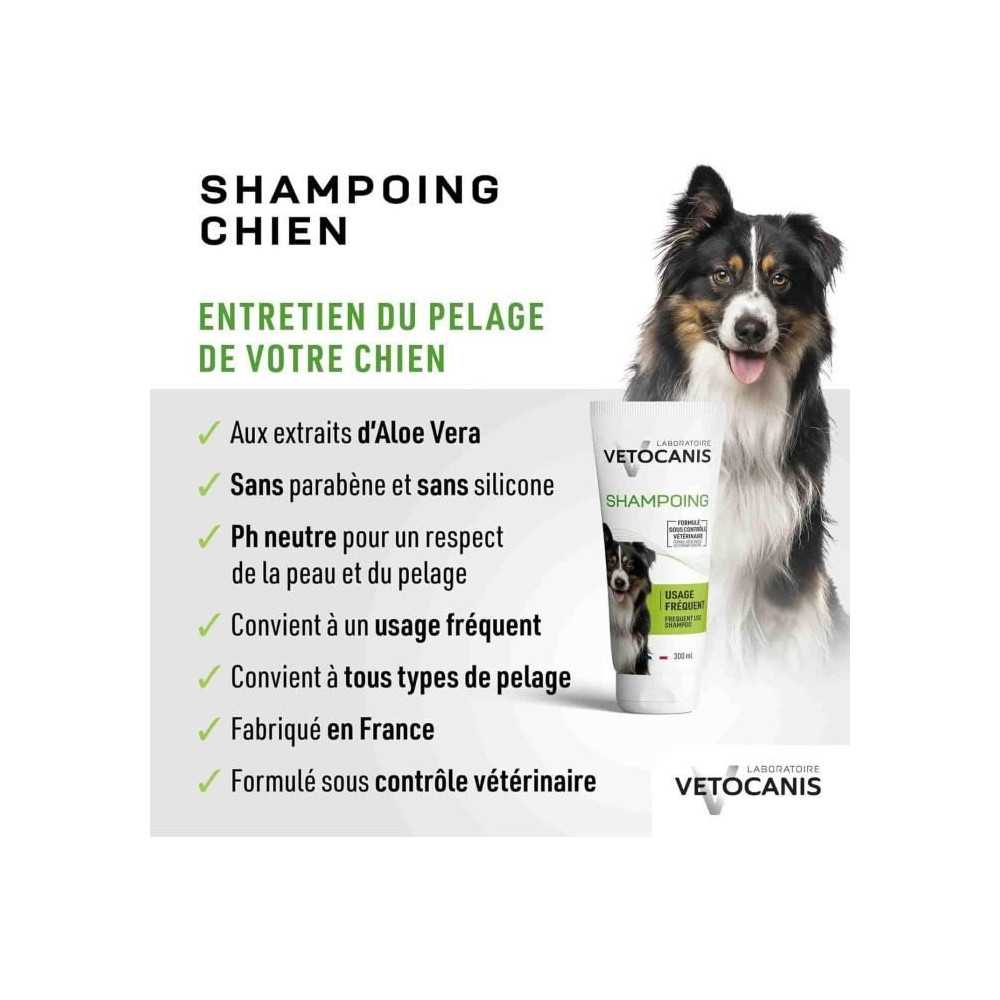 Ce shampooing Vétocanis, à usage fréquent pour les chiens, nettoie en douceur et hydrate. En effet, ses propriétés hydratantes et adoucissantes préservent la peau des irritations causées par les lavages trop répétés et conservant l'éclat du pelage.
