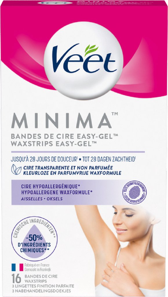 VEET Bande de cire aiselle EAN du produit 3059944026758. [Unité] [Soins du corps] Bandes de Cire: Hydrogenated Styrene / Methyl Styrène, Indene Copolymer, Paraffinum Liquidum, Silica, Polyéthylène, Pentaerythrityl Tretra-Di-T-Butyl, Hydroxyhydrocinnamate Lingettes: Paraffinum Liquidum, Hexyldecyl Stearate, Parfum, Tocopheryl Acetate, Limonene.