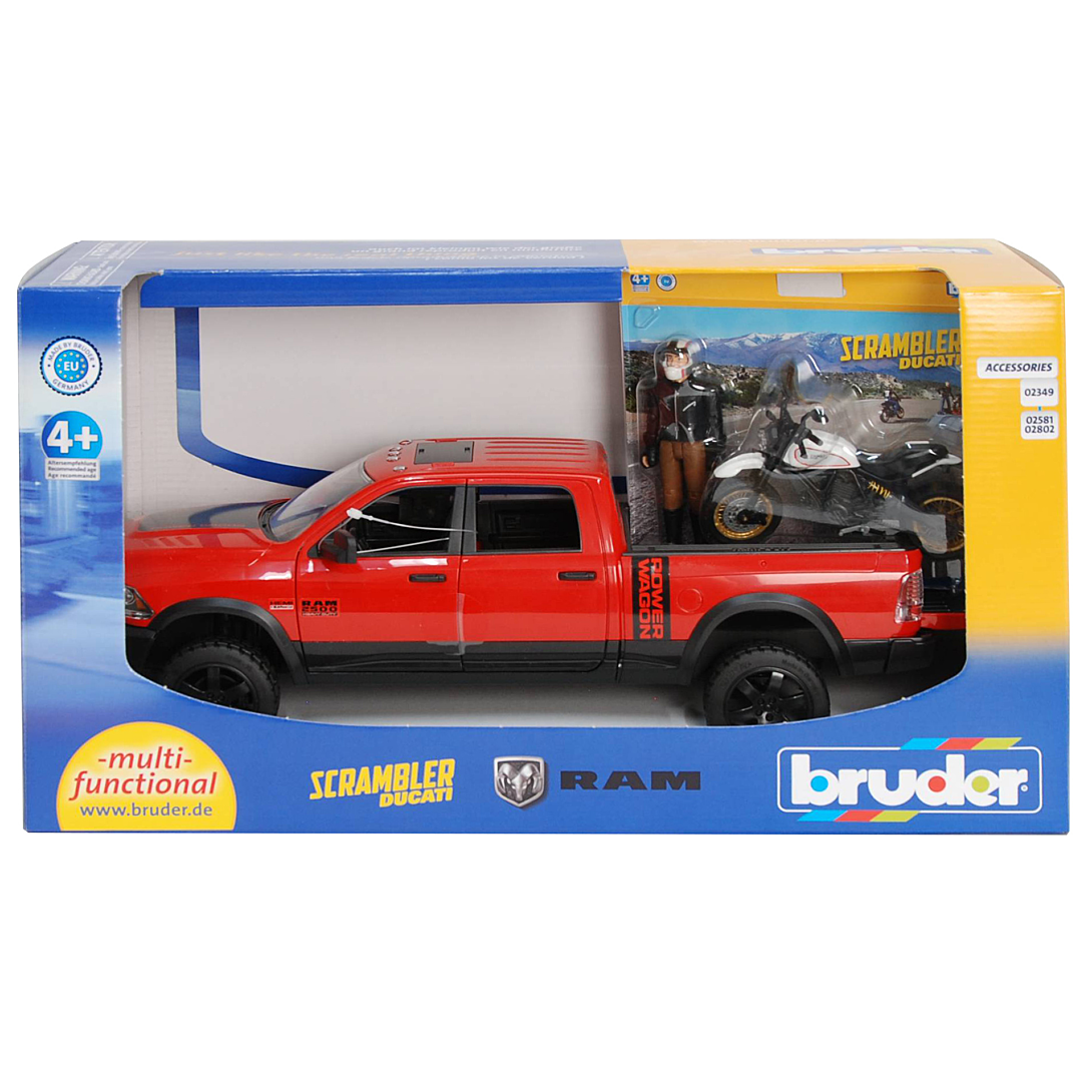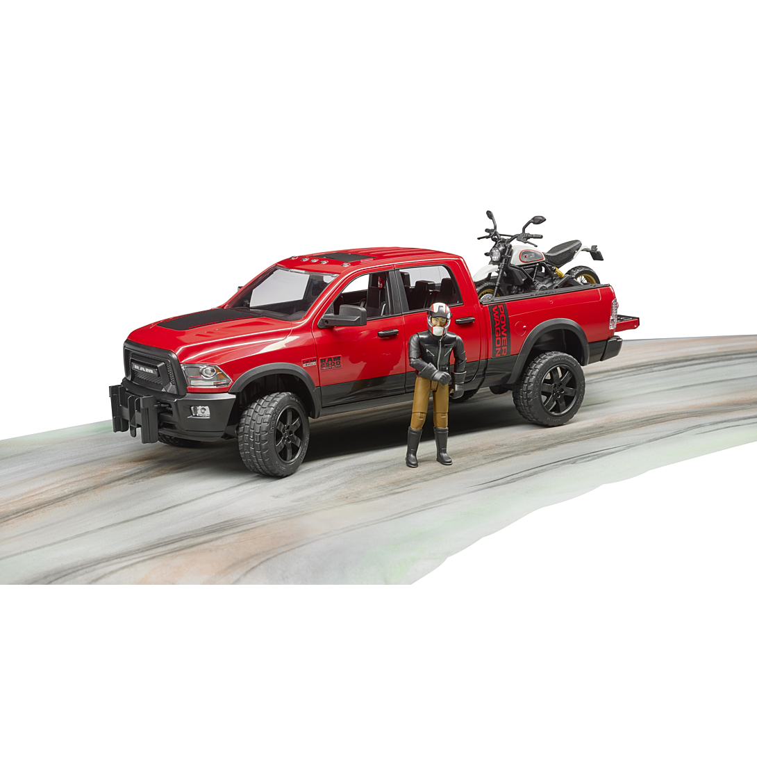 Le véhicule RAM 2500 est conçu pour rouler hors route. Elle peut ainsi transporter la moto DUCATI sur sa plateforme de chargement. Les portes s'ouvrent pour accueillir les figurines. Le véhicule présente une suspension sur les deux essieux. L'essieu avant peut être directionnel en utilisant l'extension du volant incluse. La fourche à l'arrière permet de fixer la moto DUCATI sur la zone de chargement en utilisant les supports de transport fermés. On trouve également un ensemble de barres d'attelage amovibles. La moto DUCATI dispose de roues à hayon métallique et d'un support latéral pliant. La figurine motard présente l'équipement de motard authentique, avec casque et gants de moto. Dim. : 40x70x15 cm