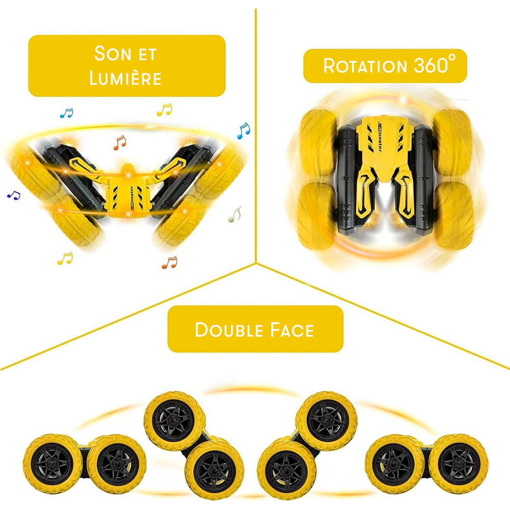 Offrez à votre enfant ou à vous-même des sensations fortes avec cette voiture télécommandée tout terrain ultra-moderne. Équipée de 4 roues motrices, d'effets lumineux et sonores, et capable d’atteindre une vitesse impressionnante de 14 km/h, cette voiture est conçue pour conquérir tout type de terrain. Que ce soit pour des courses effrénées ou des acrobaties spectaculaires, sa fonction de rotation à 360° et son mode tornade garantissent une expérience de jeu captivante. ➔PERFORMANCE TOUT TERRAIN : Grâce à ses 4 roues motrices, cette voiture télécommandée est capable de rouler sur une grande variété de surfaces : route, herbe, gravier et même dans le sable. Sa conception robuste assure une conduite fluide et dynamique, peu importe l'environnement. ➔ ROTATION À 360° : Cette voiture est capable d'effectuer des rotations complètes sur elle-même, ajoutant un côté acrobatique à vos courses. Amusez-vous à exécuter des vrilles et des pirouettes avec précision, offrant un véritable spectacle lors de chaque utilisation. ➔ EFFETS LED ET SONORES: Les lumières LED colorées ajoutent une touche futuriste à la voiture, surtout lorsqu'elle roule dans l'obscurité. Les effets sonores viennent amplifier l'action en créant une immersion totale dans l'aventure. ➔ VITESSE DE 14 KM/H: Cette voiture n'est pas un simple jouet, elle offre des performances impressionnantes avec une vitesse de pointe de 14 km/h. Assez rapide pour des courses excitantes, elle saura satisfaire les amateurs de vitesse tout en restant facilement contrôlable. ➔ FONCTION TORNADE: La voiture dispose d’un mode spécial "tornade", permettant d'effectuer des tours et des vrilles spectaculaires. Cette fonctionnalité unique apporte une touche d'originalité à vos sessions de jeu, vous offrant des mouvements totalement inédits et captivants. Caractéristiques Type de véhicule : Voiture télécommandée tout terrain, 4 roues motrices (4x4) Échelle : 1/28 Design futuriste avec deux couleurs disponibles : Jaune Vitesse maximale : 14 km/h, idéale pour les courses rapides et les acrobaties Rotation 360° : Permet des mouvements circulaires complets pour des acrobaties impressionnantes Fonction tornade : Mode spécial pour des vrilles spectaculaires, offrant un spectacle visuel unique Conduite cascadeur double face. Système d'éclairage LED : Équipée de lumières LED multicolores sur les roues et le châssis, créant des effets lumineux époustouflants, particulièrement visibles dans l'obscurité Effets sonores intégrés : Sons dynamiques et réalistes pour une immersion totale dans l'action Télécommande 2,4 GHz : Technologie de contrôle à distance offrant une portée allant jusqu'à 30 mètres, sans interférences avec d'autres appareils Distance de contrôle : 150 m. Fonction tout terrain : Grâce à sa conception robuste, la voiture peut rouler sur des surfaces variées comme l'asphalte, l'herbe, le sable et les chemins caillouteux Châssis renforcé : Conception résistante aux chocs, spécialement conçue pour les cascades et les sauts sur des terrains difficiles Suspension indépendante : Chaque roue est dotée d'une suspension indépendante pour une meilleure absorption des chocs et une conduite plus fluide Roues antidérapantes : Pneus en caoutchouc haute adhérence avec une structure renforcée pour une traction optimale sur tous types de terrains Autonomie : Batterie rechargeable offrant jusqu’à 30 minutes de jeu continu (batterie Li-ion de 3,7V., rechargeable, 500mAh répond aux normes spécifiques). Temps de recharge : Environ 2-3 heures pour une charge complète Dimensions : Longueur : 15 cm Largeur : 17 cm Hauteur : 6 cm Poids du véhicule : Environ 310 gr, facilitant la manipulation pour les enfants Poids de la télécommande : 110 gr environ Âge recommandé : À partir de 6 ans et plus Matériaux : Plastique ABS de haute qualité et métal pour une plus grande durabilité et résistance aux chocs Résistance à l'eau : Étanchéité IPX4, protège contre les éclaboussures, mais non immergeable Fréquence de la télécommande : 2,4 GHz, permettant le contrôle de plusieurs voitures simultanément sans interférences Design ergonomique : Télécommande intuitive et facile à utiliser, conçue pour les mains des enfants et des adultes Chargeur inclus : Chargeur USB compatible avec la majorité des adaptateurs Chargement rapide de la batterie : 2 heures. Batterie pour télécommande : 2xAA (non incluses). La voiture télécommandée et son système électrique sont certifiés CE et respecte les normes des jouets pour enfants