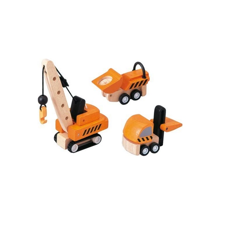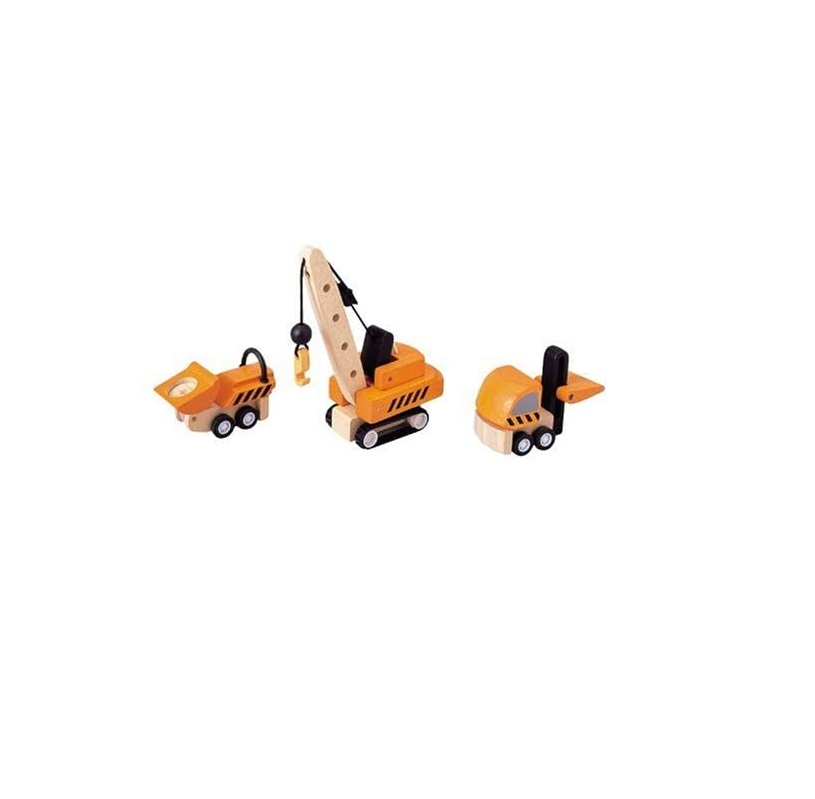 Set de véhicules de construction, des véhicules de chantier en bois de la marque Plan Toys. Référence PT6087.