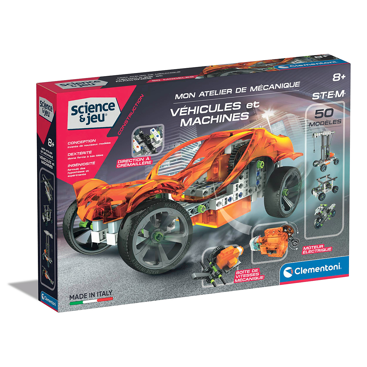 • Un atelier de mécanique incroyable pour enseigner aux enfants les principes fondamentaux de la mécanique et de l'ingénierie. • Grâce à plus de 250 composants, il est possible de réaliser plus de 50 constructions de difficulté variable. • Cette boîte permet notamment de construire un monte-charge, un hélicoptère ou encore une voiture, équipée d'un moteur électrique, d'un système de direction et de 2 vitesses ! • Les 3 manuels scientifiques illustrés guident l'enfant pas à pas pour chaque construction afin qu'il évolue en autonomie et en toute sécurité. • Le design, le concept, le développement et la fabrication sont intégralement réalisés en Italie !