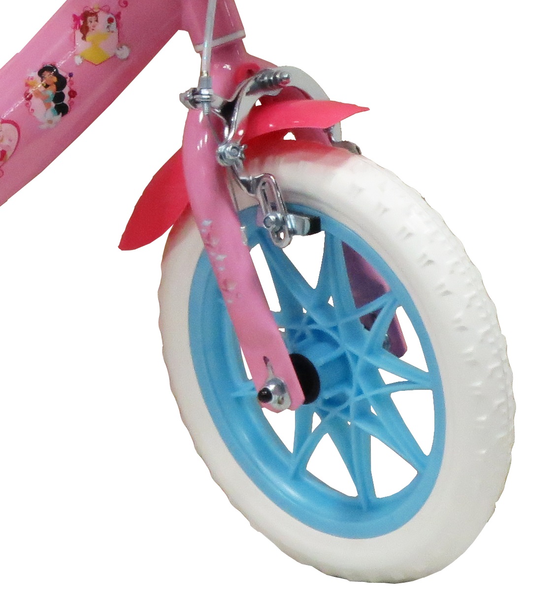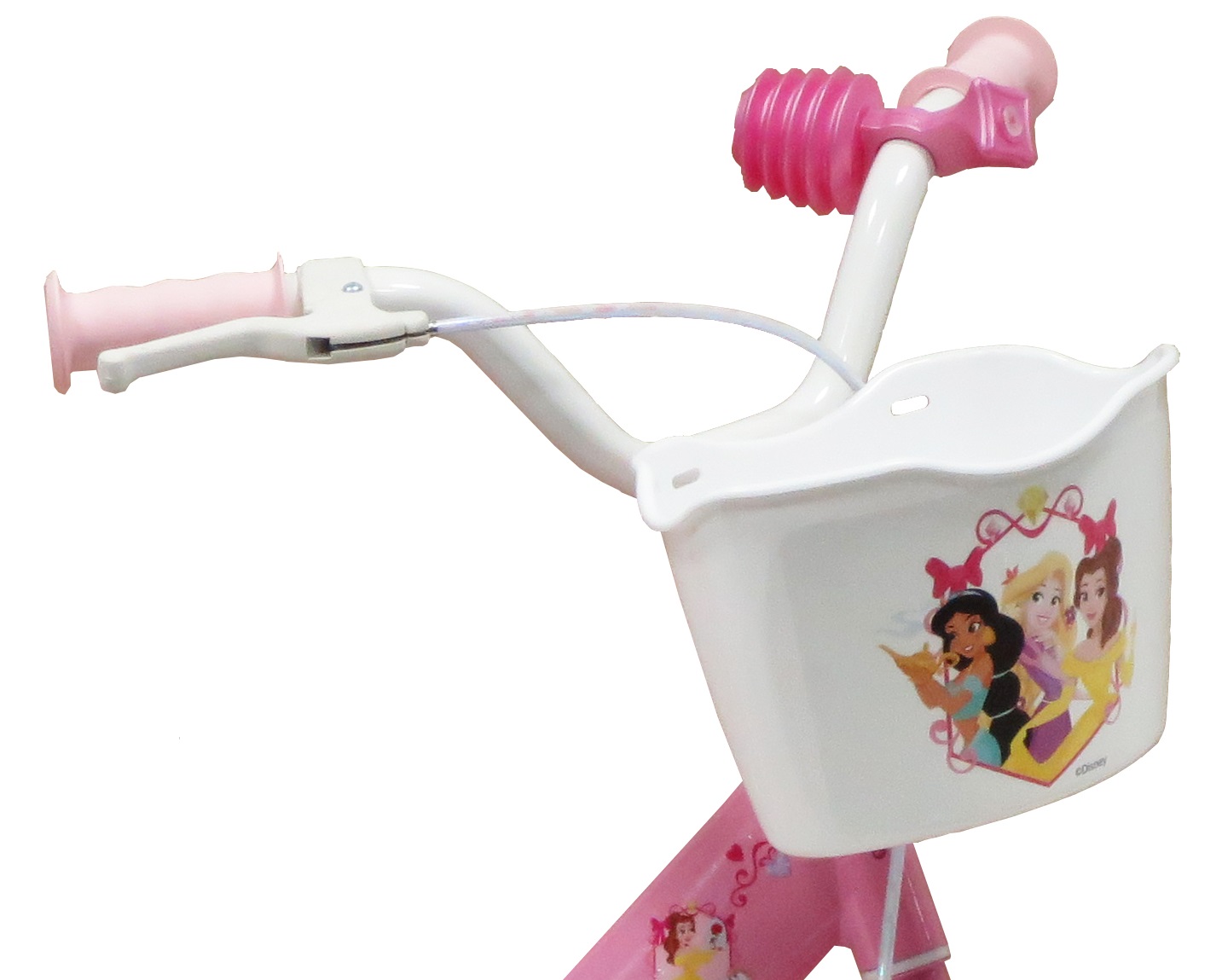 Vélo 12" Fille Licence "Princess" pour enfant de 2 à 4 ans - Cadre Acier - Direction et pédalier en nylon -Transmission monovitesse - Pignon fixe - Frein avant Calliper - Carter de chaîne intégral - Gardes boue et poignées spécifiques pour augmenter la protection de l'enfant - Pneus EVA - Stabilisateurs (montage sans outil) - Avertisseur sonore - Panier avant - Porte-poupée