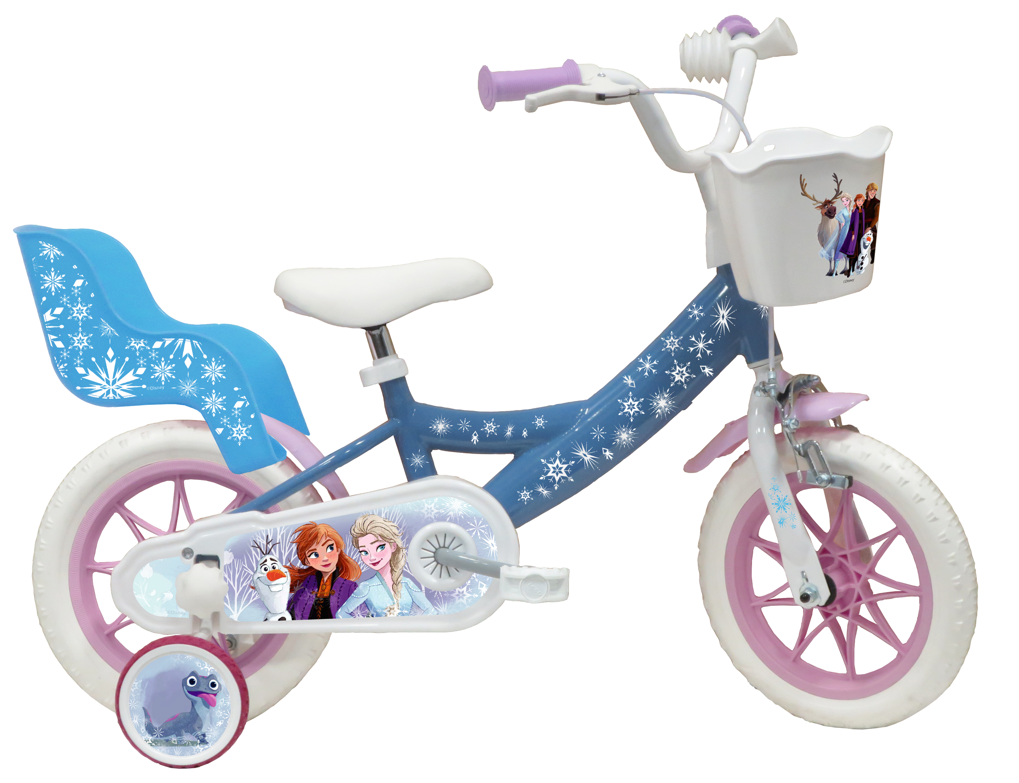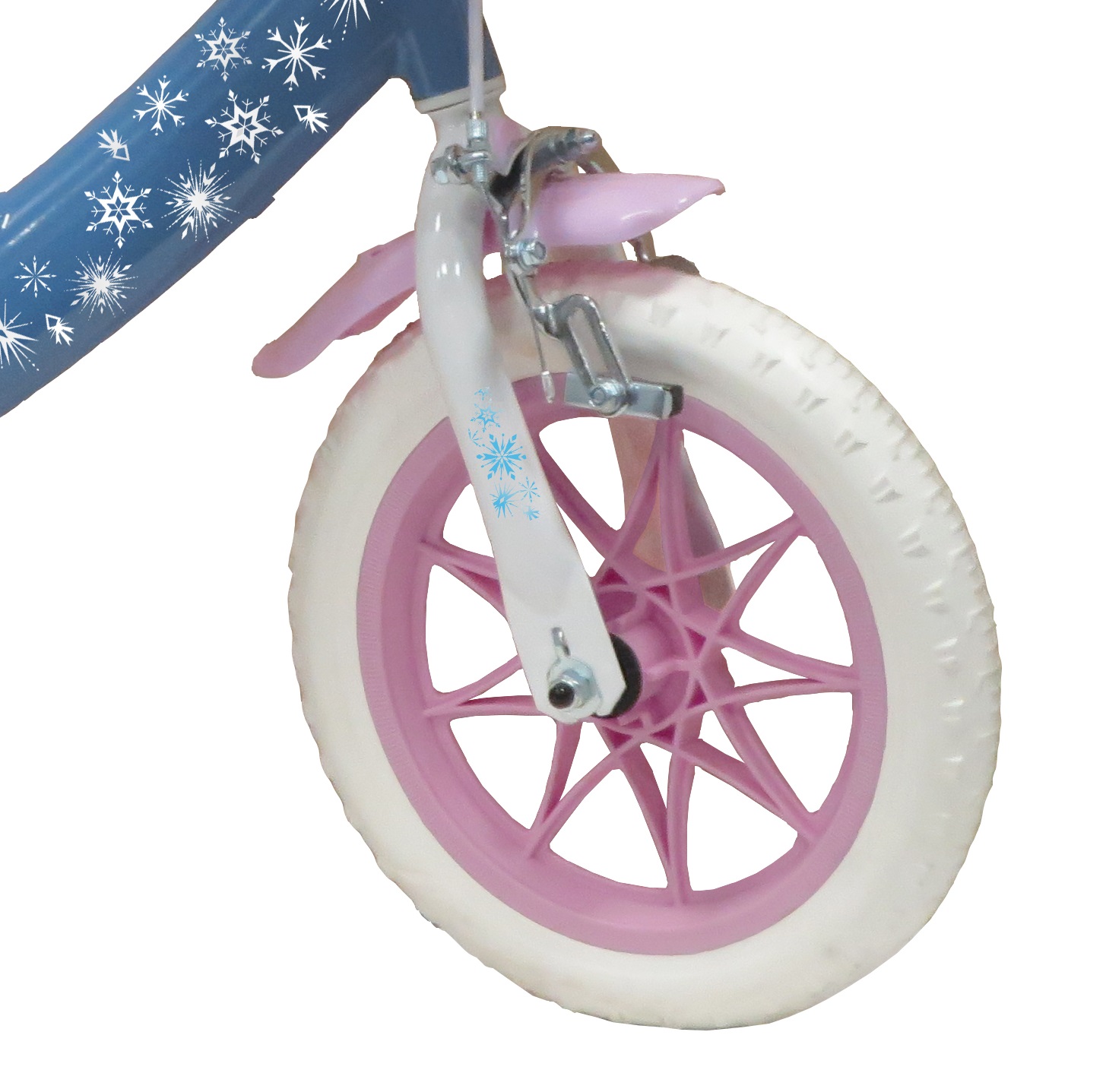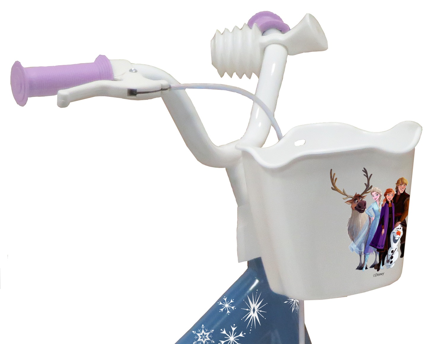 Vélo 12" Fille Licence "Reine des Neiges" pour enfant de 2 à 4 ans - Cadre Acier surbaissé pour enjambement aisé - Direction et pédalier en nylon - Transmission monovitesse - Pignon fixe - Frein avant Calliper - Carter de chaîne intégral - Gardes boue et poignées spécifiques pour augmenter la protection de l'enfant - Roues bâtons - Pneus EVA increvables - Stabilisateurs (montage sans outil) - Panier avant - Porte poupée - Avertisseur sonore