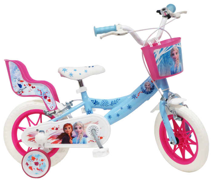 Libellé Vélo 12" Fille Licence "Reine des Neiges" pour enfant de 3 à 5 ans avec stabilisateurs à molettes - Porte poupée - Panier avant - 2 freins