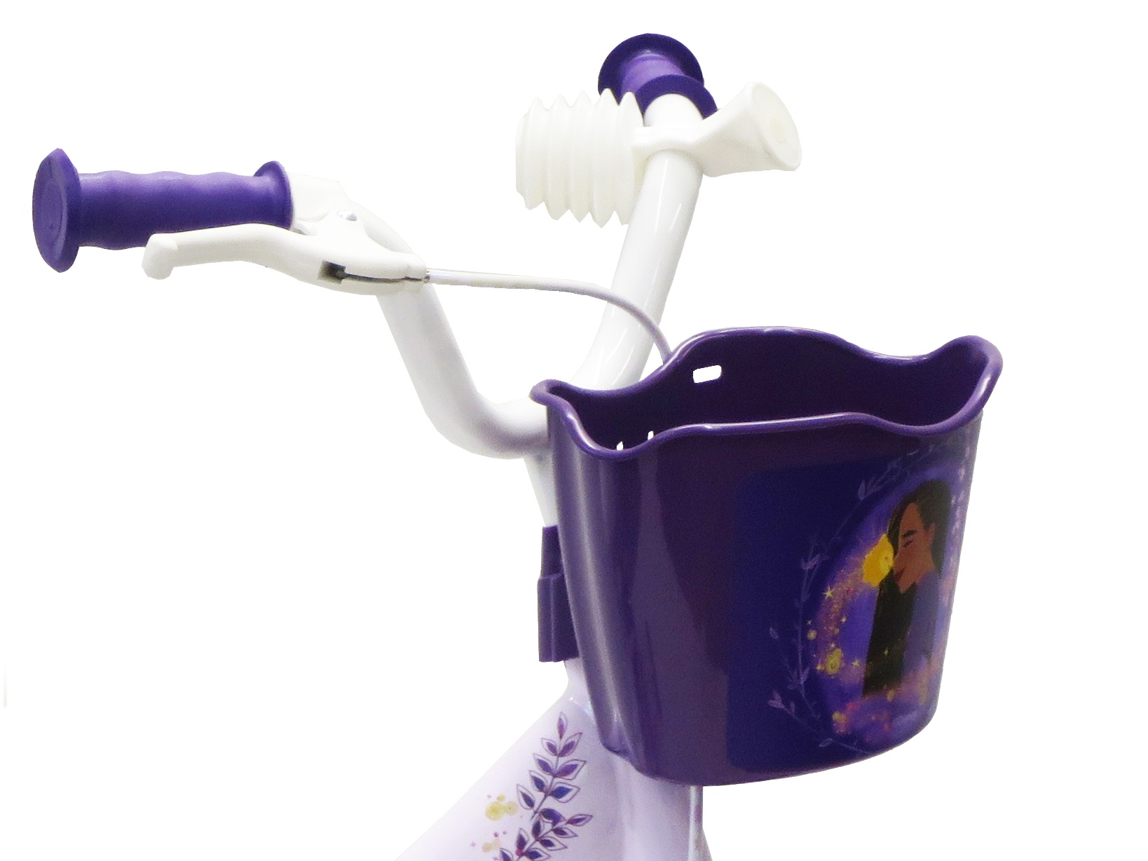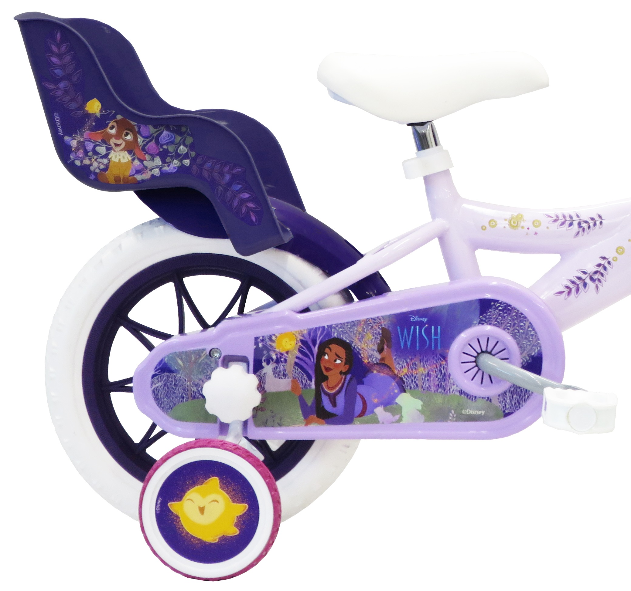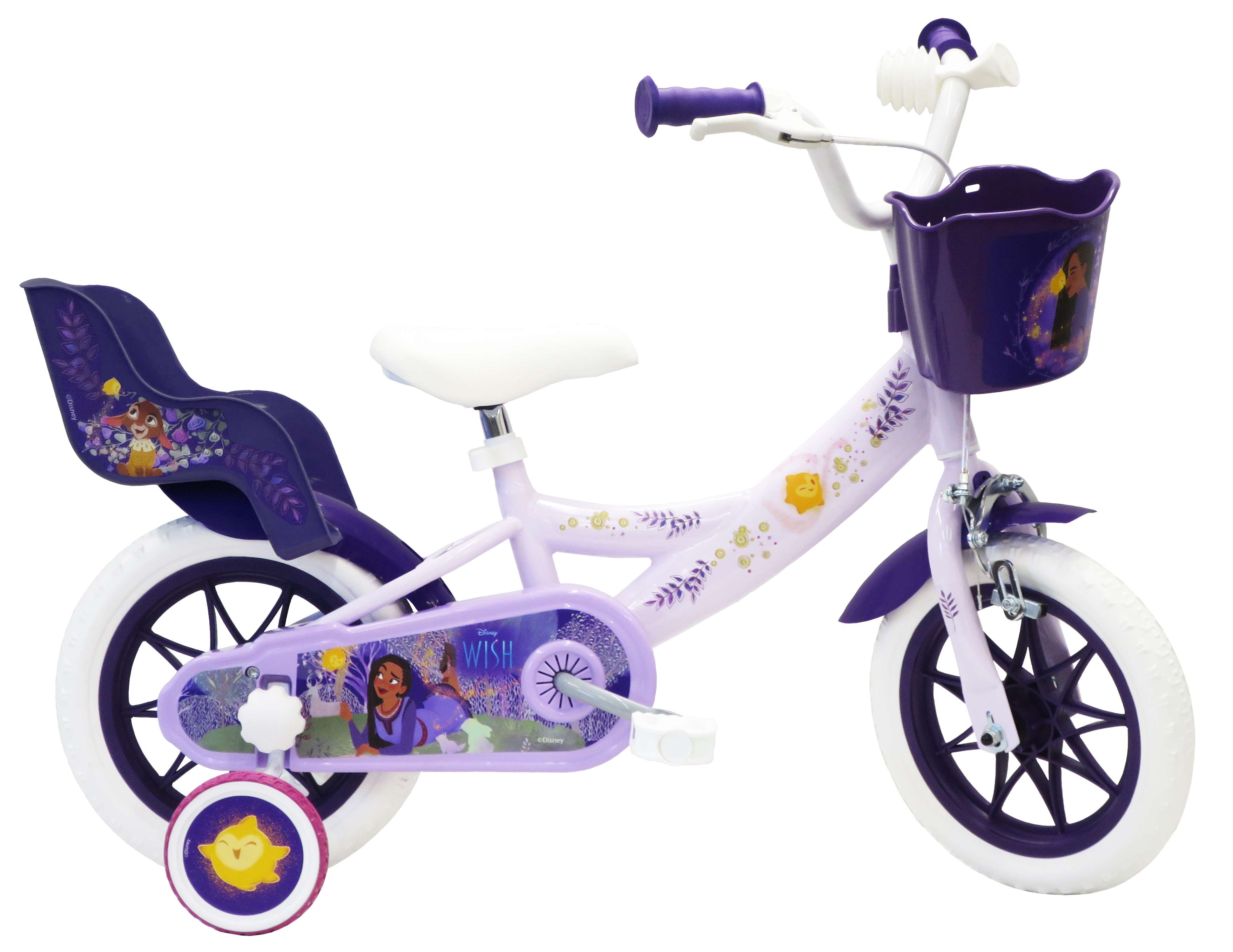 Vélo 12" Fille Licence "Wish, Asha et la bonne étoile" pour enfant de 85/100 cm - Cadre Acier surbaissé pour enjambement aisé - Direction et pédalier en nylon - Transmission monovitesse - Pignon fixe - Frein avant Calliper - Carter de chaîne intégral - Gardes boue et poignées spécifiques pour augmenter la protection de l'enfant - Roues bâtons - Pneus EVA increvables - Stabilisateurs (montage sans outil) - Panier avant - Porte poupée - Avertisseur sonore