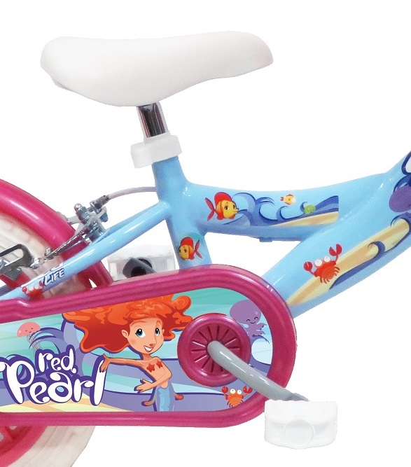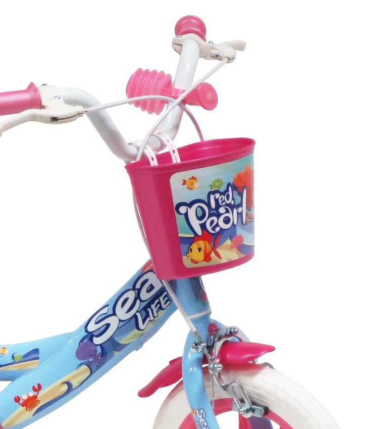 Vélo 12" Fille "Sea-Life" pour enfant de 3 à 5 ans - Cadre Acier - Direction et pédalier en nylon - Pignon fixe - Frein avant et arrière Calliper - Carter de chaîne intégral - Gardes boue et poignées spécifiques pour augmenter la protection de l'enfant - Roues bâtons - Pneus EVA increvables - Stabilisateurs (montage sans outil) - Panier avant - Avertisseur sonore