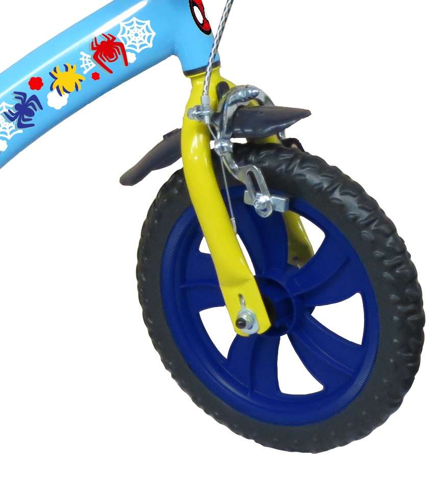 Vélo 12" Garçon"SPIDEY" pour enfant de 3 à 5 ans - Cadre Acier - Direction et pédalier en nylon -Transmission monovitesse - Pignon fixe - Frein avant Calliper - Carter de chaîne intégral - Gardes boue et poignées spécifiques pour augmenter la protection de l'enfant - Pneus EVA - Stabilisateurs (montage sans outil) - Plaque décorative avant - Porte bidon - Gourde - Avertisseur sonore