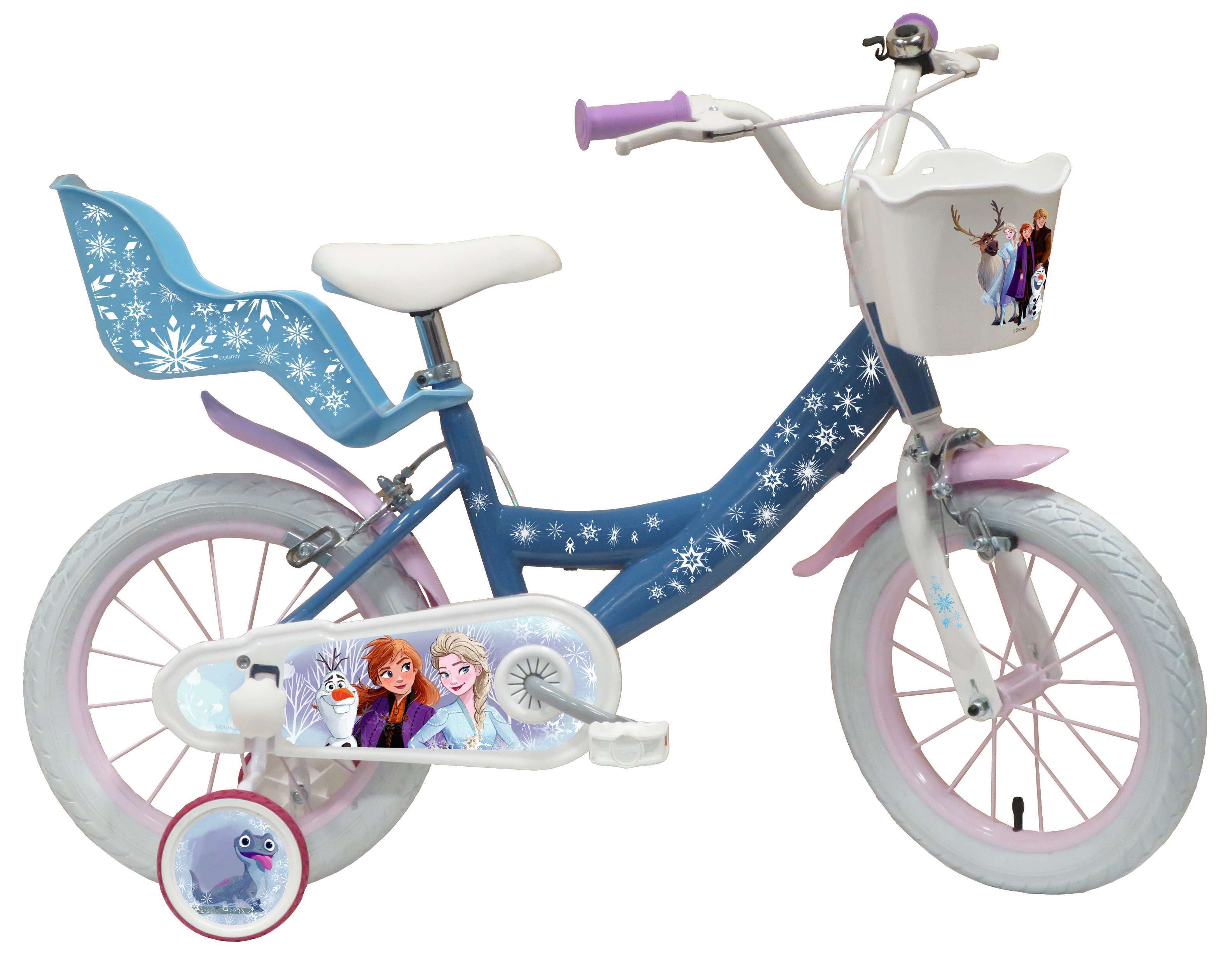 Vélo 14" Fille Licence "Reine des Neiges" pour enfant de 4 à 6 ans - Cadre Acier surbaissé pour enjambement aisé - Direction et pédalier en nylon - Roue libre monovitesse - Freins avant et arrière Calliper - Selle réglable - Carter de chaîne intégral - Gardes boue et poignées spécifiques pour augmenter la protection de l'enfant - Jantes à rayons - Pneus gonflables blancs - Stabilisateurs (montage sans outil) - Panier avant - Porte-poupée arrière - Avertisseur sonore - Eclairage à piles fournies - Catadioptres de roues