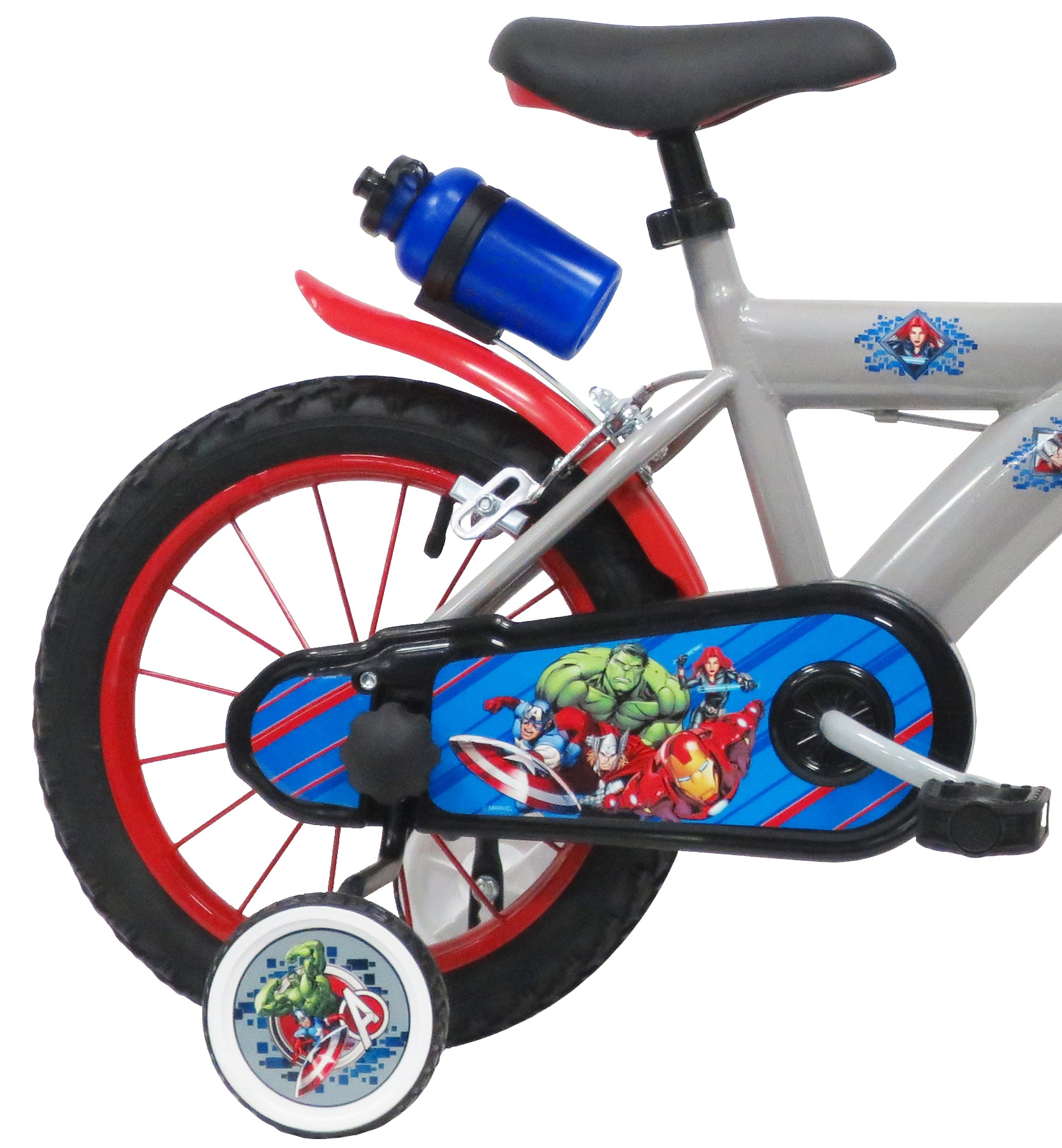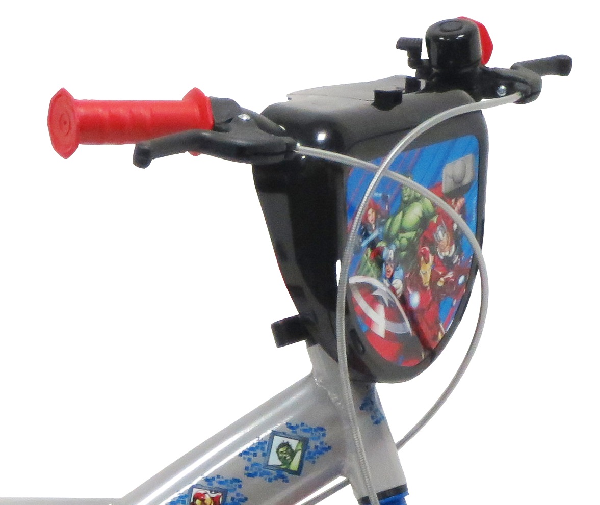 Vélo 14" Garçon Licence "Avengers" pour enfant de 4 à 6 ans - Cadre Acier - Direction et pédalier en nylon - Roue libre monovitesse - Freins avant et arrière Calliper - Selle réglable - Carter de chaîne intégral - Gardes boue et poignées spécifiques pour augmenter la protection de l'enfant - Jantes à rayons - Pneus gonflables noirs - Stabilisateurs (montage sans outil) - Plaque décorative avant - Porte bidon - Gourde - Avertisseur sonore - Eclairage à piles fournies - Catadioptres de roues