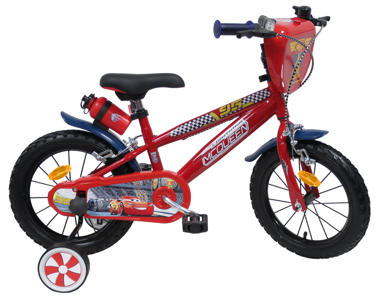 Vélo 14" Garçon "Cars" pour enfant de 4 à 6 ans - Cadre Acier - Direction et pédalier en nylon - Roue libre monovitesse - Freins avant et arrière Calliper -Selle réglable - Carter de chaîne intégral - Gardes boue et poignées spécifiques pour augmenter la protection de l'enfant - Jantes à rayons - Pneus gonflables noirs - Stabilisateurs (montage sans outil) - Plaque décorative avant - Gourde - Avertisseur sonore - Eclairage à piles fournies