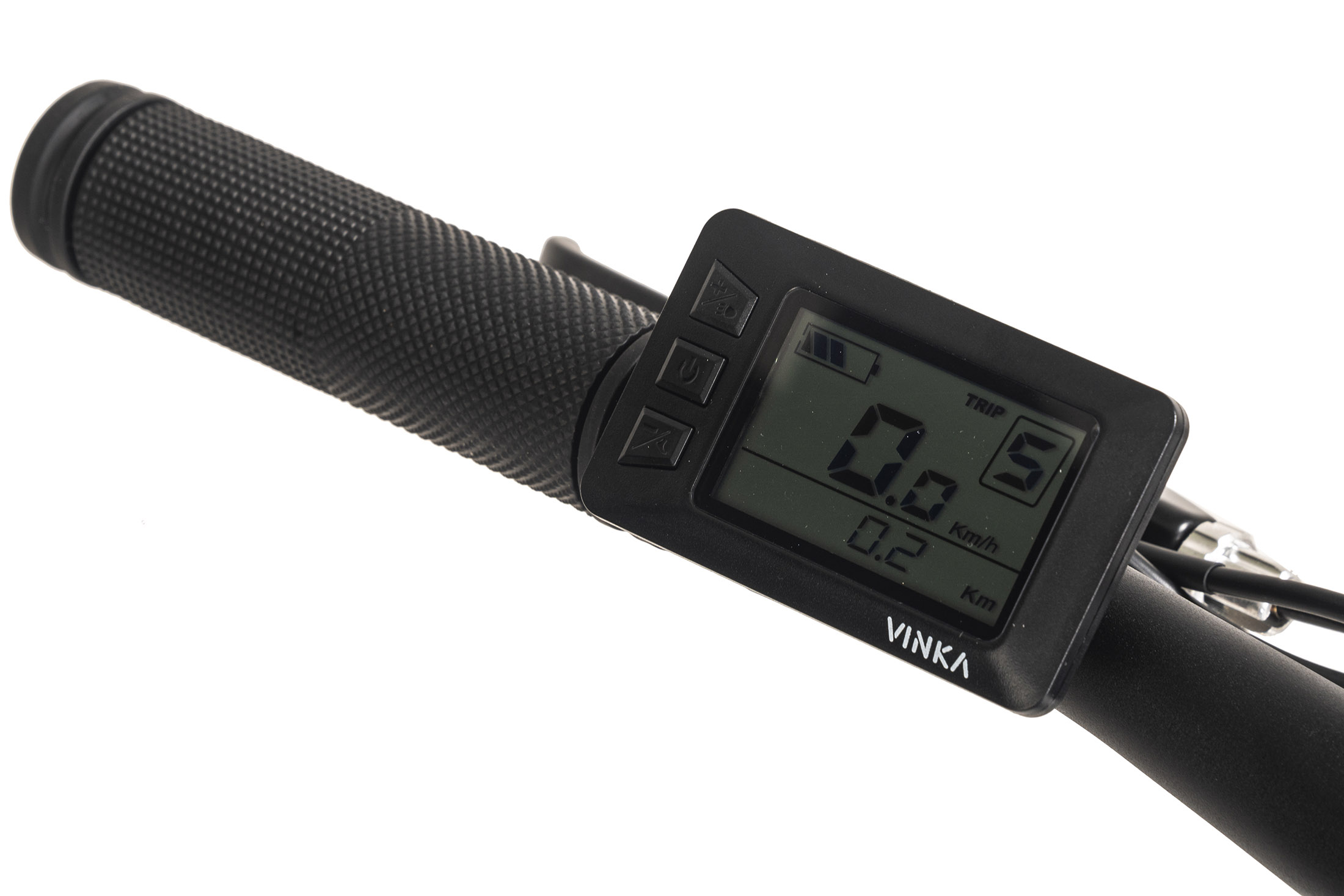 Compteur LCD VINKA HC 20 : Tu peux régler l'intensité de l'assistance du VAE et éteindre le moteur grâce au compteur. Le niveau de chargement de la batterie est affiché. Tout comme la vitesse, le nombre de kilomètres du jour, le nombre total de kilomètres parcourus, la vitesses maximale, la vitesse moyenne ainsi que la force de pédalage en Watt sont indiqués sur le compteur.