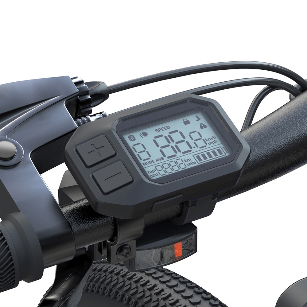 - Informations : Vitesse, Niveau de batterie, Distance parcourue/Compteur kilométrique, Niveau d'assistance, Mode poussée, Marque lumineuse, Code d'erreur, Marque de frein/dysfonctionnement
