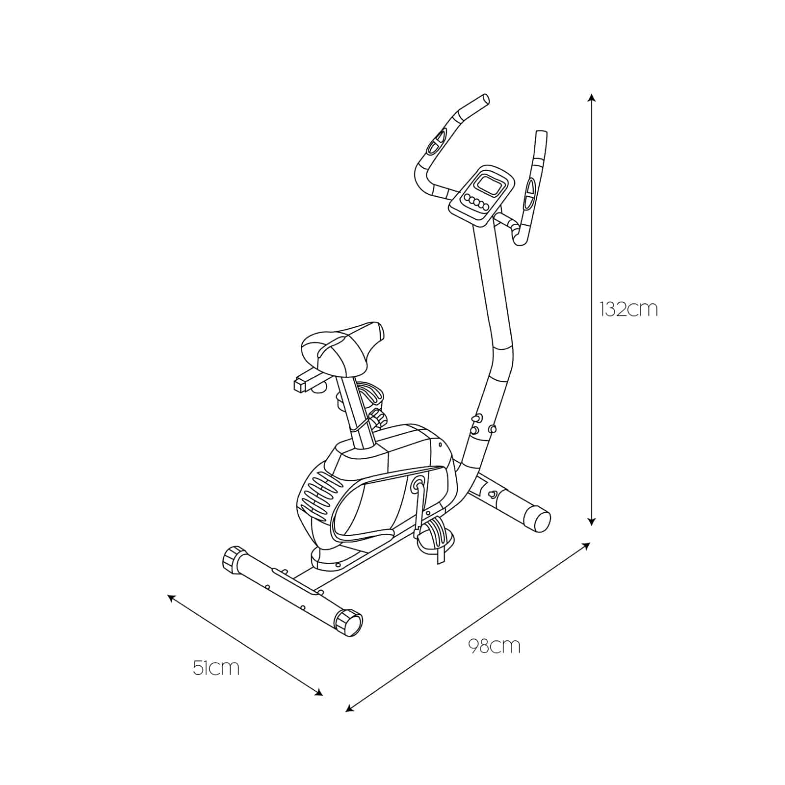 Vélo d'exercice compact haute performance pour faire de l'exercice à la maison. Perdez du poids, remettez-vous en forme ou renforcez vos muscles après une blessure avec ce vélo doté d'un système de freinage magnétique et d'un volant d'inertie de 7 kg. Grâce à ce volant d'inertie, nous pourrons générer plus d'énergie cinétique par l'effort. Vous pourrez vous entraîner sans quitter votre domicile, il vous suffira de vous installer sur son siège souple et de choisir l'intensité souhaitée parmi les 16 niveaux qu'il propose. Sur son écran LCD frontal, vous pouvez voir rapidement les principaux indicateurs de suivi de votre entraînement : temps, vitesse, fréquence cardiaque, distance parcourue, calories brûlées et tours par minute. Caractéristiques : - Dimensions : 98x51x132 cm. - Pliable : Non. - Poids : 26,5 kg. - Poids maximal autorisé : 100 kg. - Taille recommandée pour l'utilisateur : 150-180 cm. - Cadre : acier. - Couleur : noir et gris. - Moniteur de fréquence cardiaque sur le guidon : Oui. - Moniteur de fréquence cardiaque Clamp : Non. - Guidon rembourré : Oui. - Guidon réglable : Oui. - Système de freinage : magnétique, motorisé. - Disque d'inertie : 7 kg. - Régulateur de tension : 16 niveaux. - Programmes de formation : Oui, 20. - Régulation de la résistance : électrique. - Ordinateur électronique multifonction : Oui. - Affichage LCD : Oui. - Fonctions : Temps, vitesse, distance, pouls, calories et révolutions par minute. - Siège réglable : Oui, en hauteur et en profondeur. - Siège rembourré : Oui. - Roues : Oui.