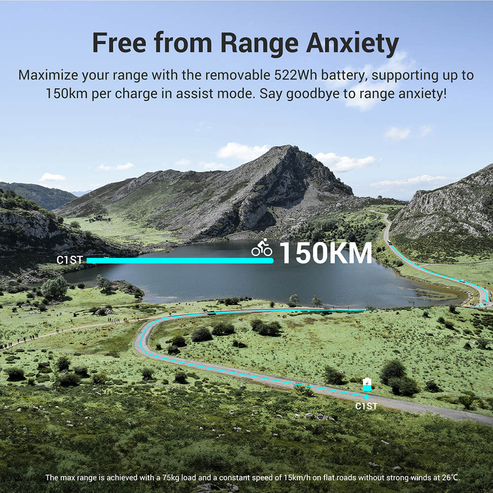 Avec une batterie lithium-ion remplaçable de 522 Wh, le vélo électrique C1 ST peut parcourir sans effort 150 km (93,2 mi) par charge en mode assistance, ce qui est largement suffisant pour gérer vos déplacements quotidiens ou vos aventures cyclistes longue distance. Avec le C1 ST, vous pouvez rouler sans vous soucier de l'autonomie.