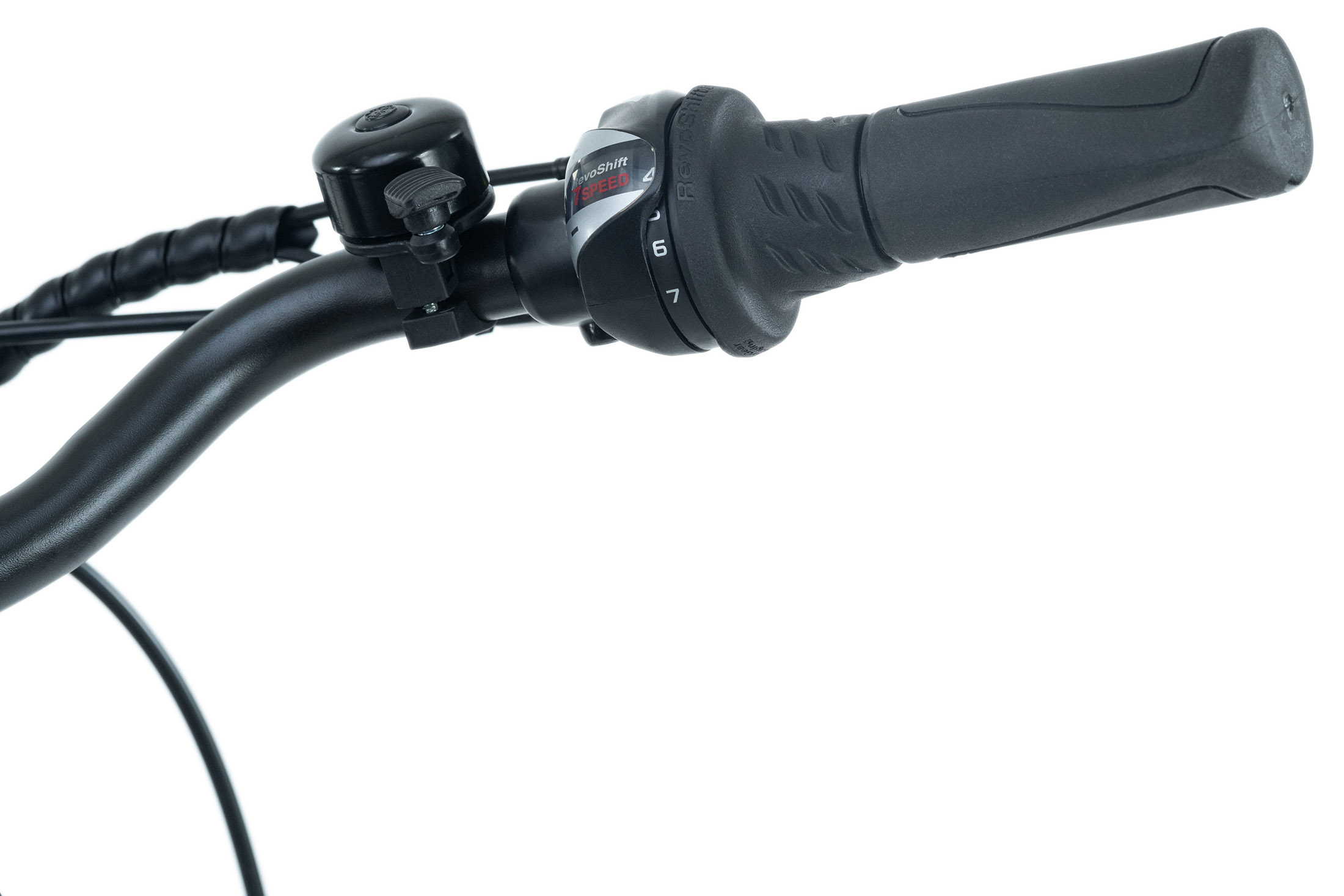 Le boîtier du guidon vous permet d'une part de choisir entre cinq niveaux d'assistance, et d'autre part de surveiller le niveau de chargement de la batterie grâce aux LED. Il est équipé d'un dérailleur SHIMANO 7 vitesses et d'une fourche suspendue ZOOM.