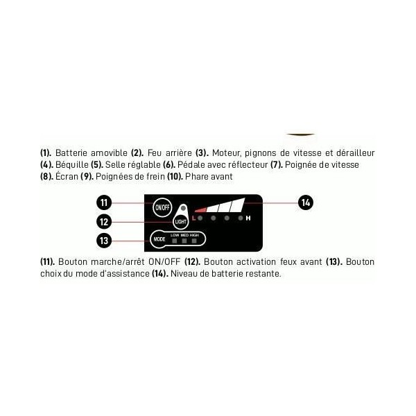 | Plus produit | Cadre acier GRIS - 6 vitesses avec dérailleur Shimano® - Freins a disque - Moteur arriere 250W - Couple moteur 42 Nm - Batterie amovible sécurisée (2 clés) 10 Ah, autonomie jusqu'a 40km - 3 modes d'assistance |