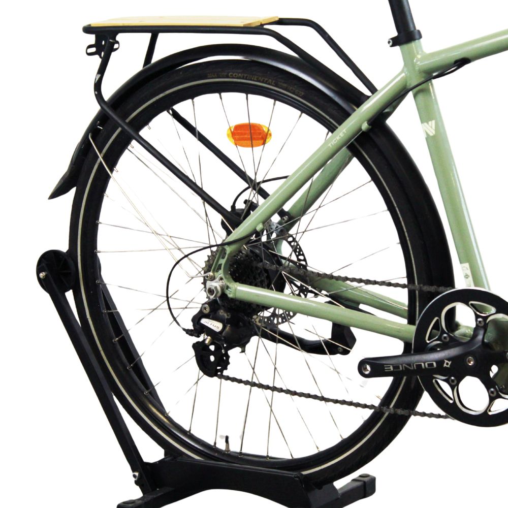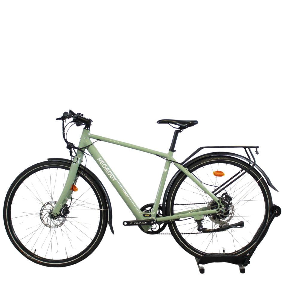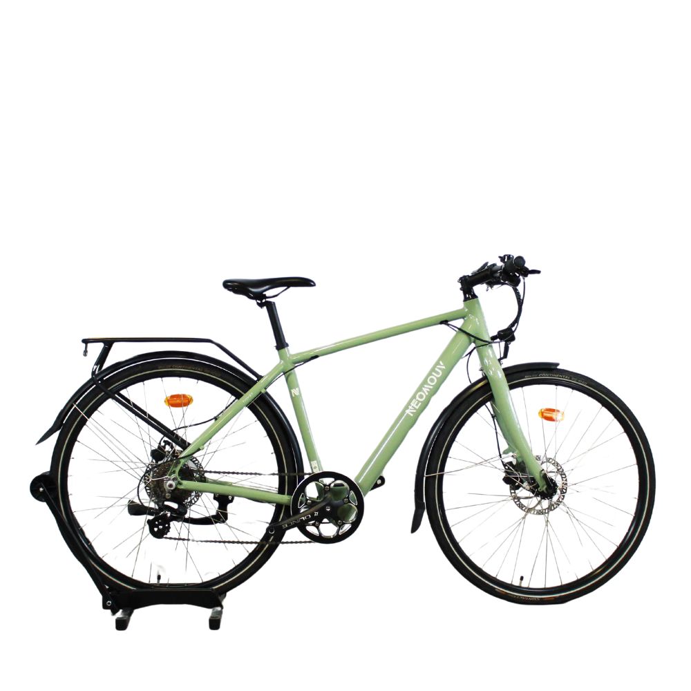 | Plus produit | Vélo électrique Neomouv Ticket, cadre aluminium à enjambement haut pour la ville, assistance limitée à 25 km/h et autonomie jusqu'à 60 km, moteur brushless roue arrière de 85 Nm, batterie 36V 10Ah (360Wh), freins à disque Tektro, transmission 8 vitesses, poids 18 kg, coloris vert d'eau. |
