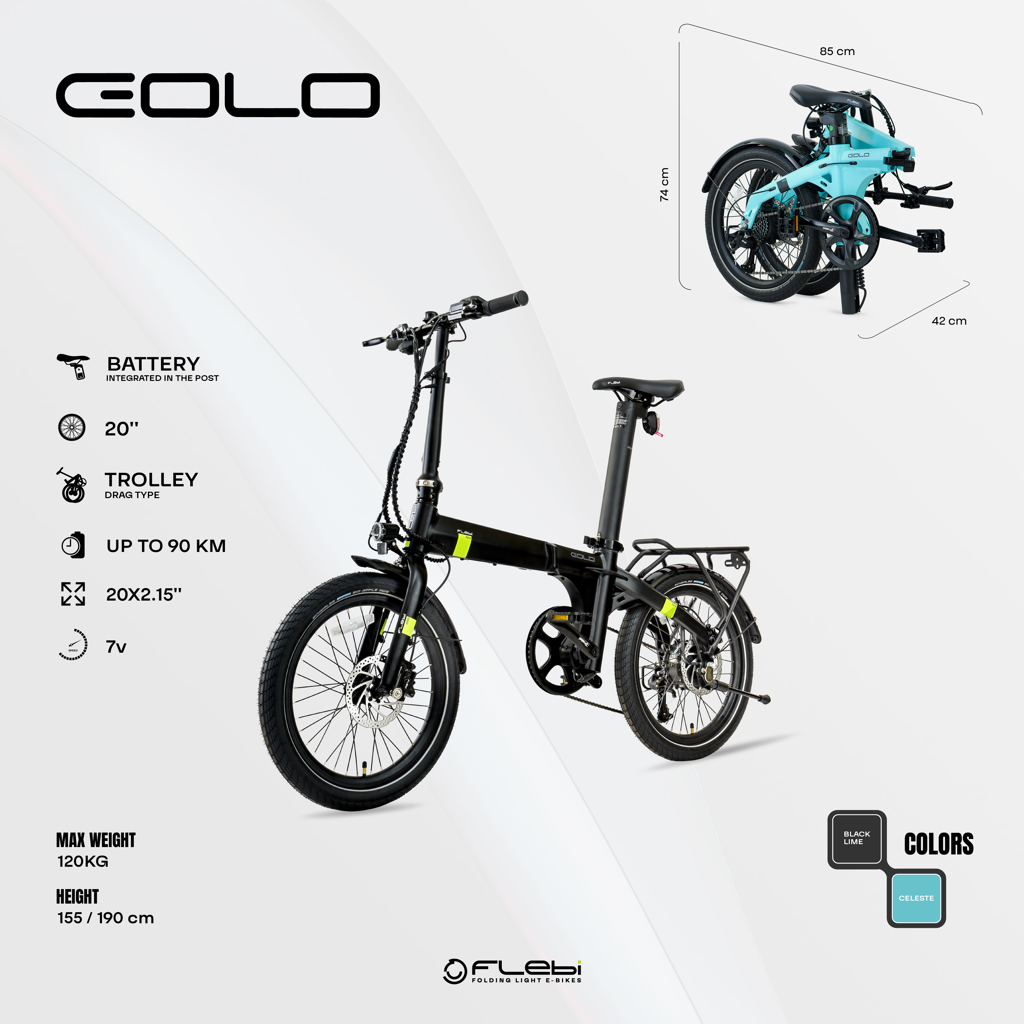 L'Eolo est un vélo électrique pliant avec des roues de 20". C'est un vélo électrique au design spectaculaire, robuste et confortable à conduire, profitez du vélo le plus urbain de Flebi !