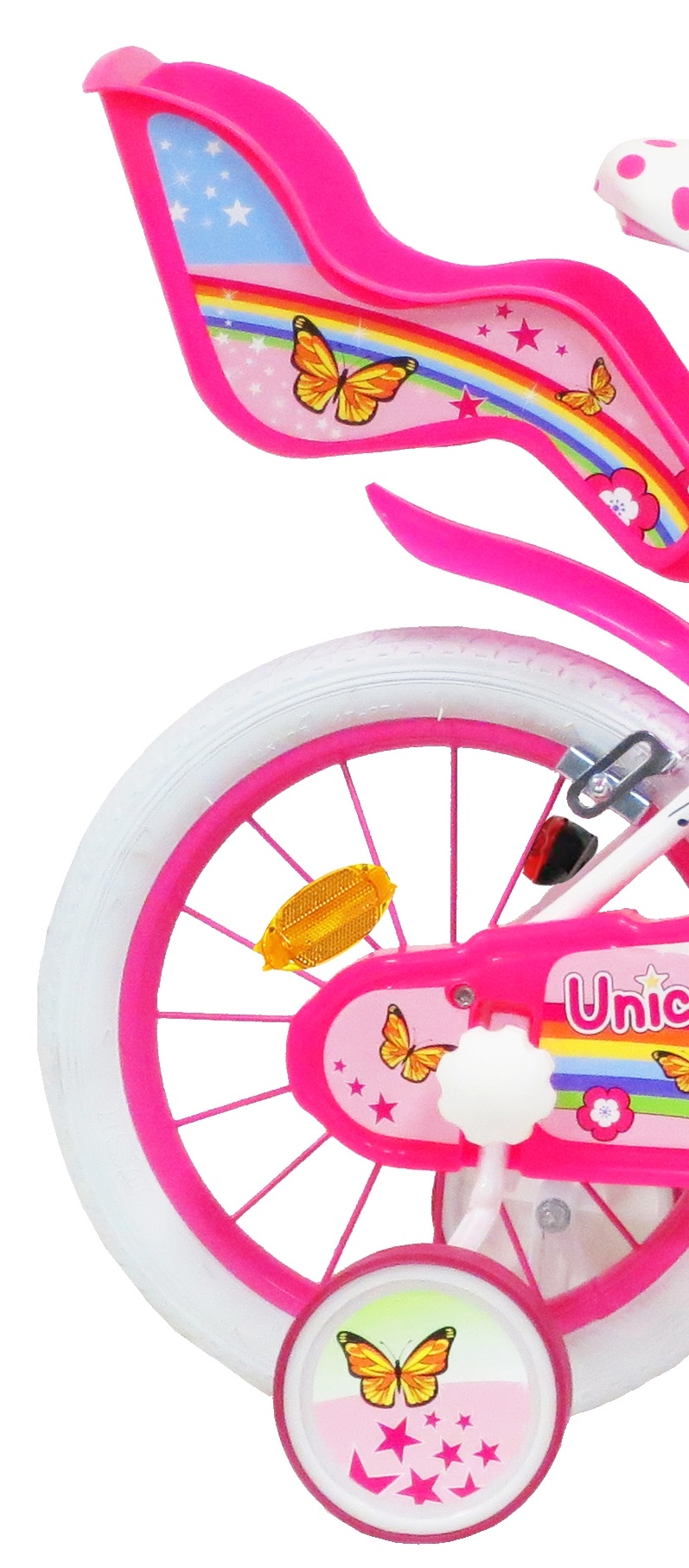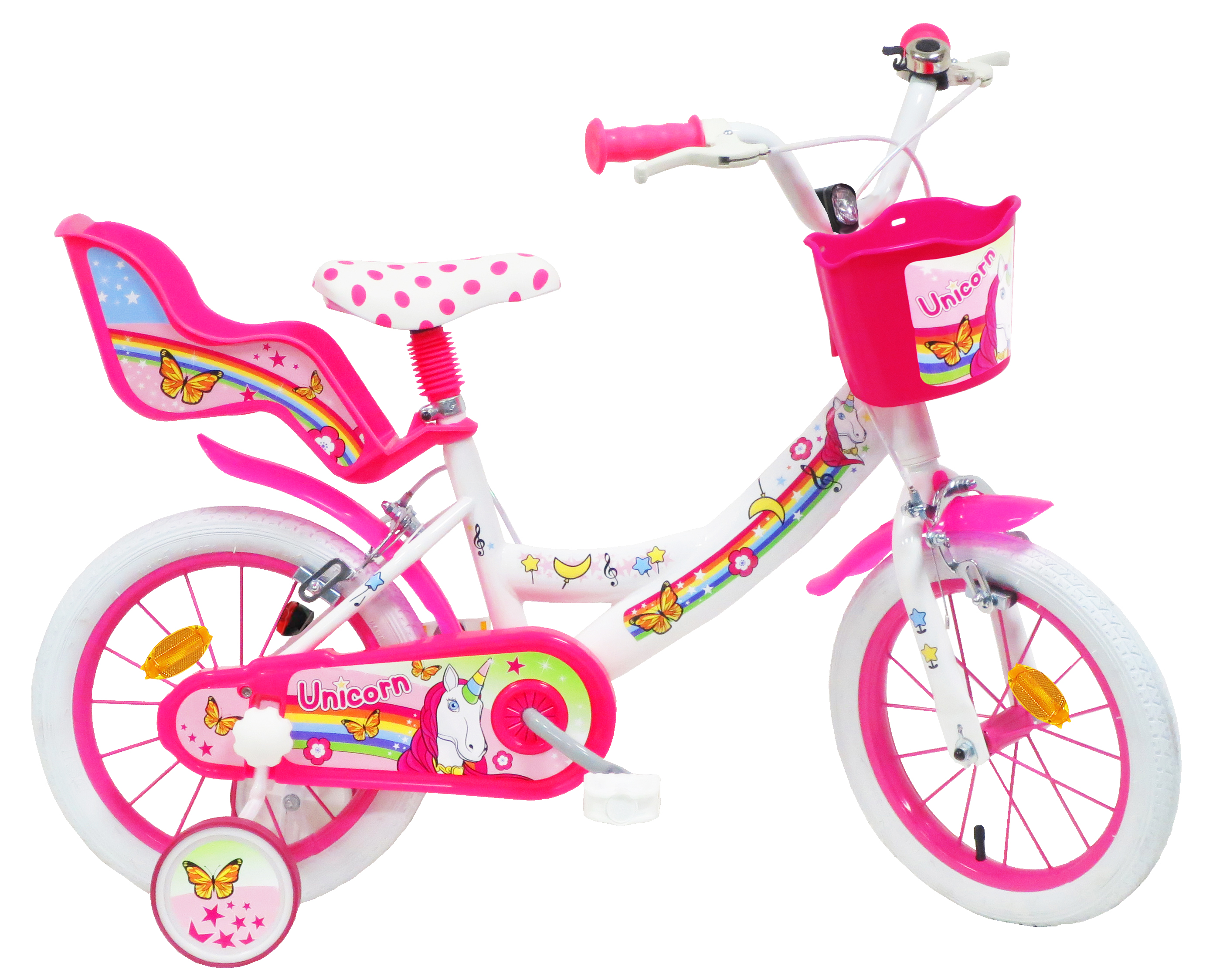 Libellé Vélo enfant 14" Fille "Licorne/Unicorn" pour enfant de 95/110 cm avec stabilisateurs à molettes - Porte poupée - Panier avant - 2 freins