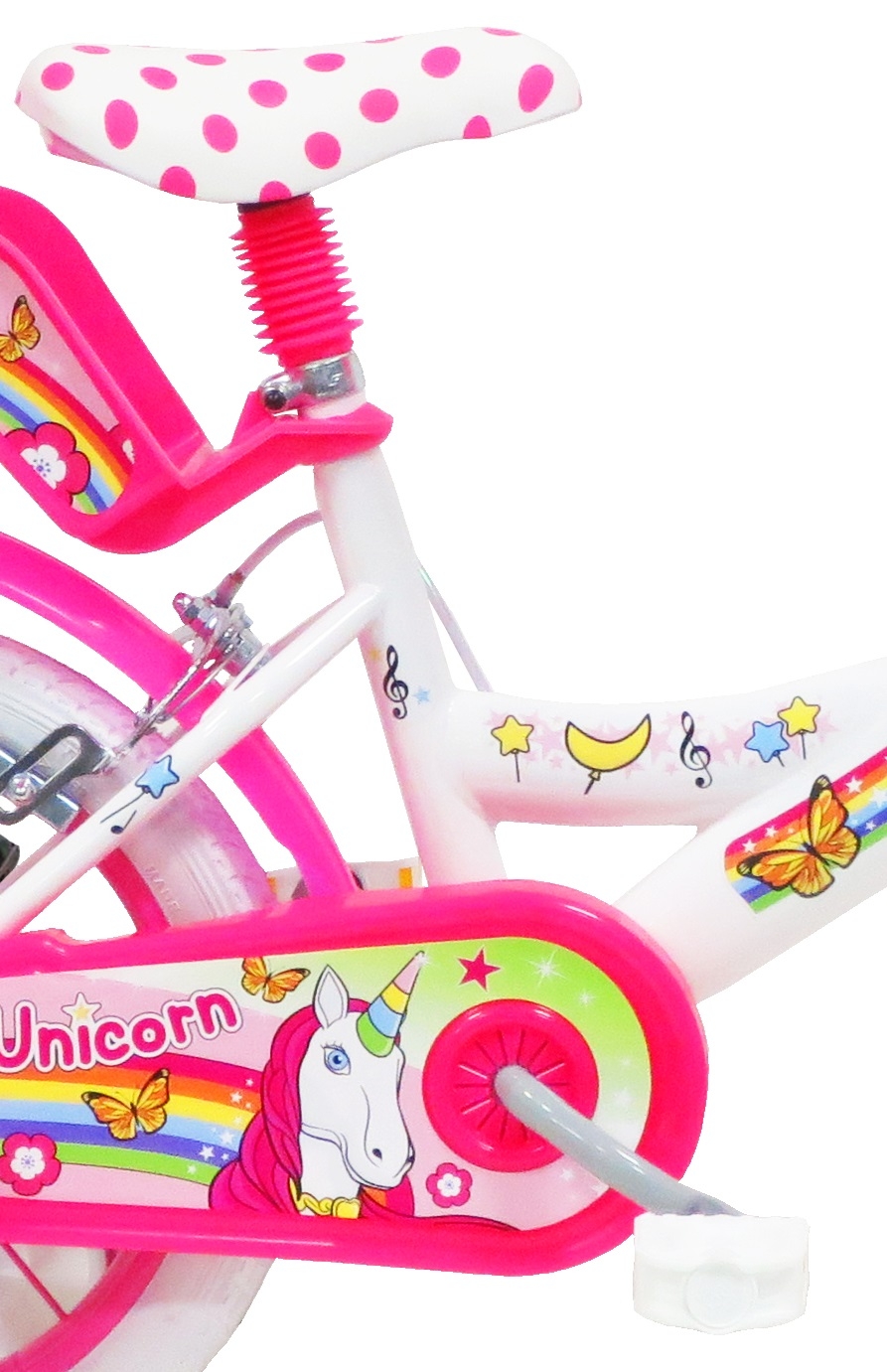 Vélo enfant 14" Fille "Licorne/Unicorn" pour enfant de 95/110 cm - Cadre Acier surbaissé pour enjambement aisé - Direction en nylon et pédalier - Roue libre monovitesse - Freins avant et arrière Calliper - Selle réglable - Carter de chaîne intégral - Gardes boue et poignées spécifiques pour augmenter la protection de l'enfant - Jantes à rayons - Pneus gonflables blancs - Stabilisateurs (montage sans outil) - Panier avant et porte-poupée arrière - Avertisseur sonore - Eclairage à piles fournies - Catadioptres de roues