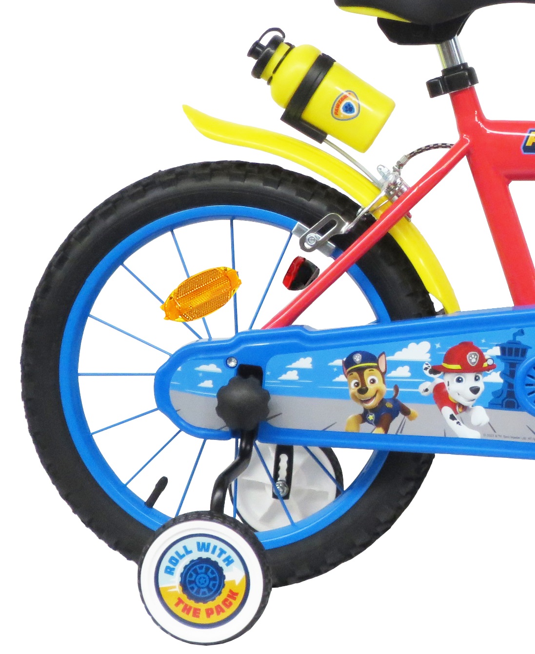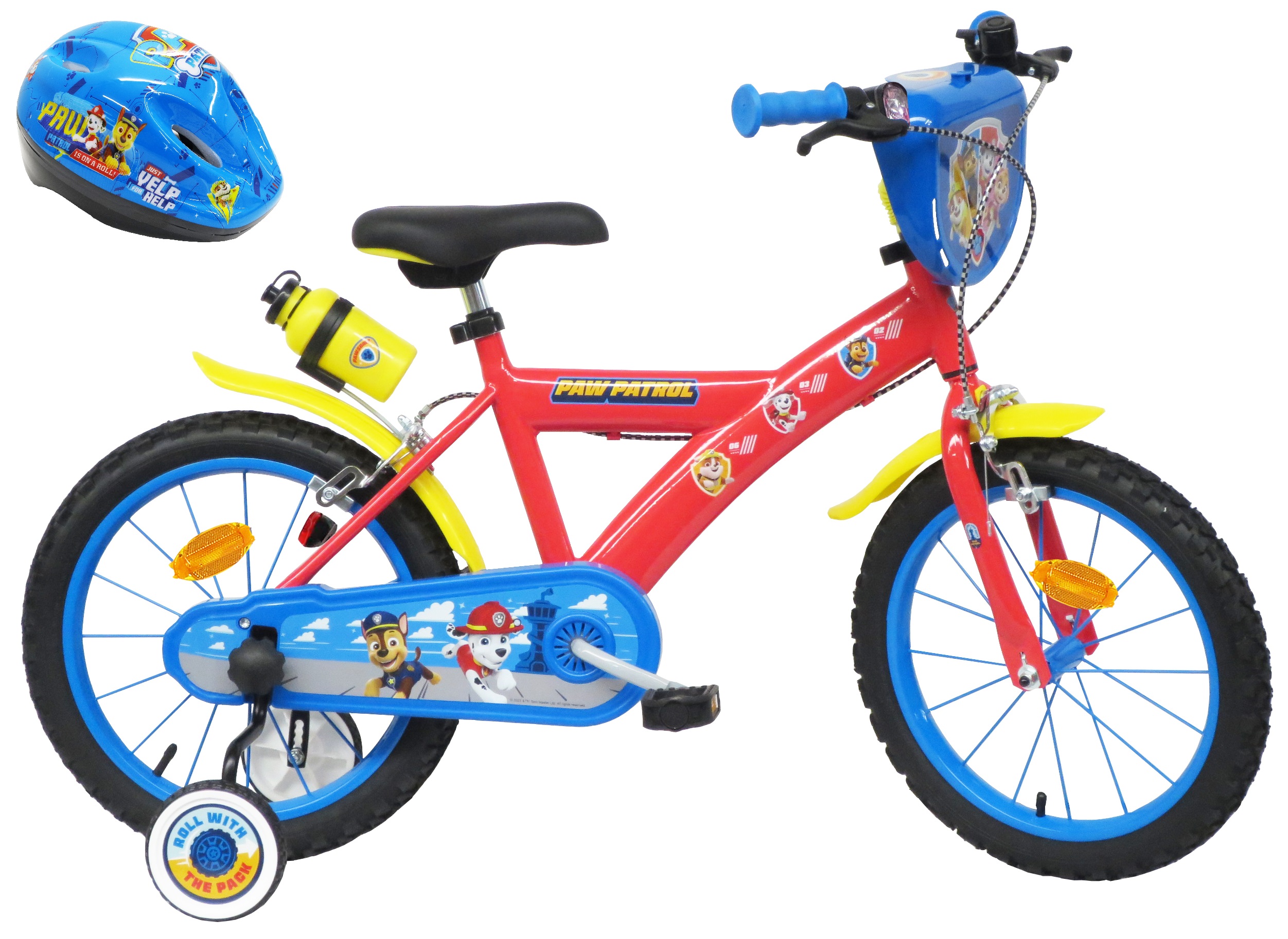 Vélo 16" Garçon Licence Pat Patrouille" + Casque pour enfant de 4 à 6 ans - Cadre Acier - Direction et pédalier en nylon - Roue libre monovitesse - Freins avant et arrière Calliper -Selle réglable - Carter de chaîne intégral - Gardes boue et poignées spécifiques pour augmenter la protection de l'enfant - Jantes à rayons - Pneus gonflables noirs - Stabilisateurs (montage sans outil) - Plaque décorative avant - Porte bidon - Gourde - Avertisseur sonore - Eclairage à piles fournies - Catadioptres de roues