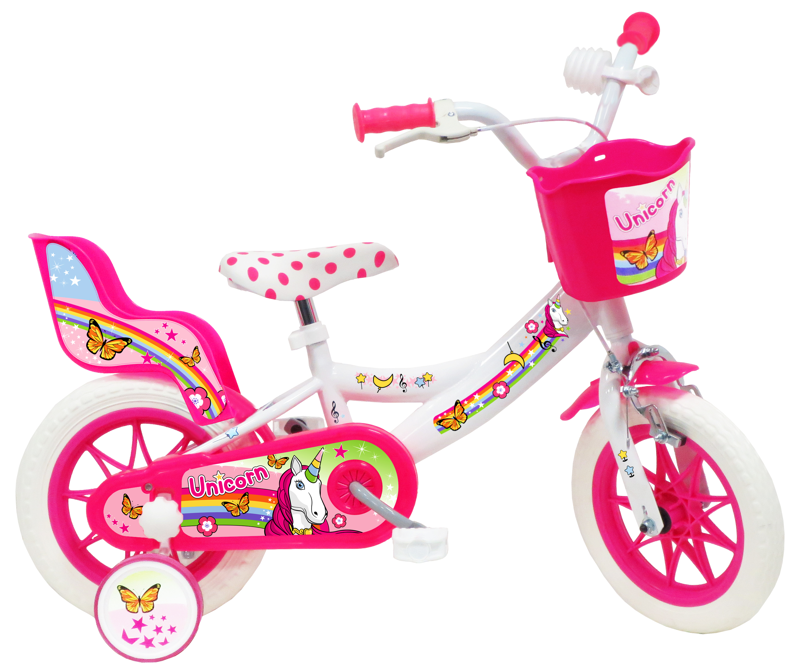 Libellé Vélo enfant - Modèle 12" Fille LICORNE/UNICORN pour enfant de 85/100 cm avec stabilisateurs à molettes - Porte poupée - Panier avant & 1 frein