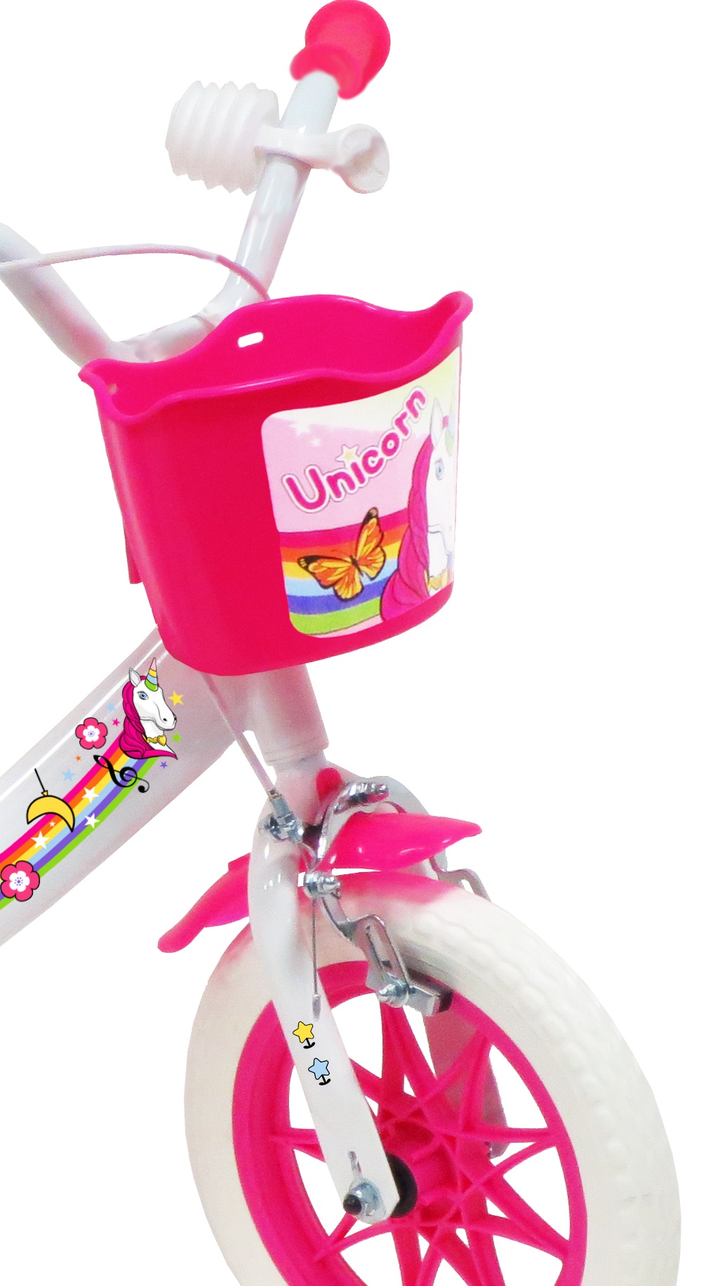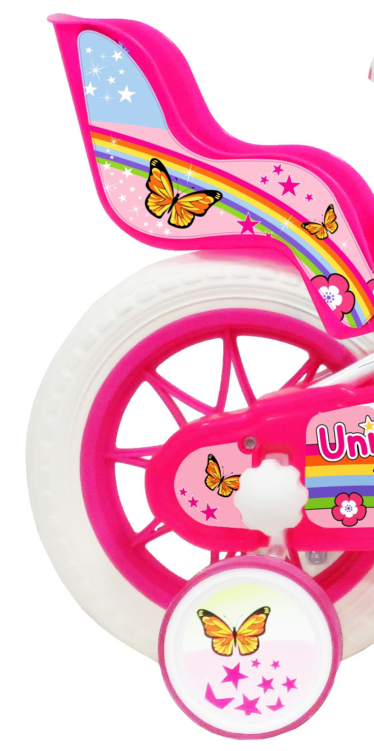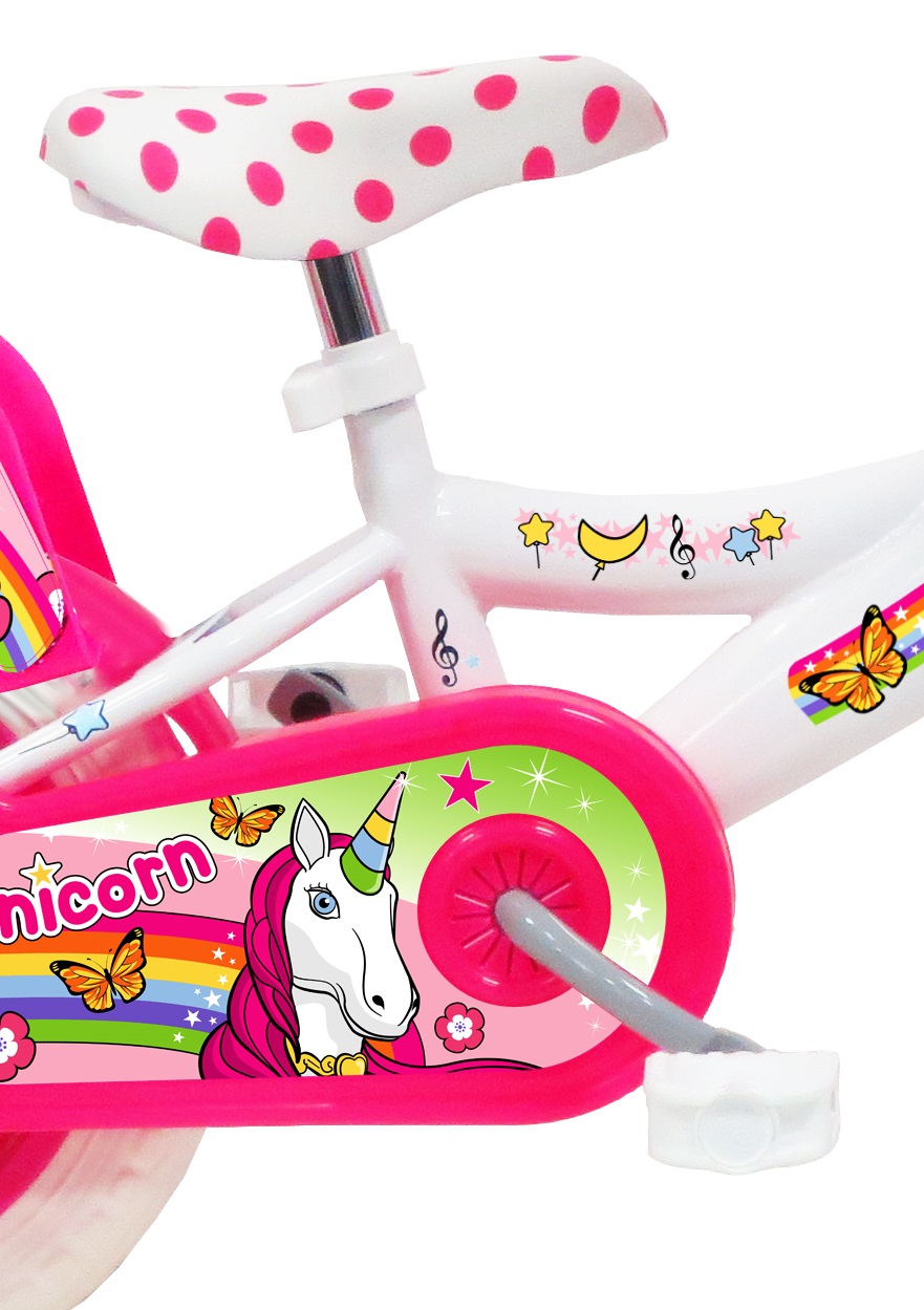 Vélo 12" Fille "Licorne/Unicorn" pour enfant de 85/100 cm - Cadre Acier surbaissé pour enjambement aisé - Direction et pédalier en nylon - Transmission monovitesse - Pignon fixe - Frein avant Calliper - Carter de chaîne intégral - Gardes boue et poignées spécifiques pour augmenter la protection de l'enfant - Roues bâtons - Pneus EVA increvables - Stabilisateurs (montage sans outil) - Panier avant et porte-poupée arrière - Avertisseur sonore
