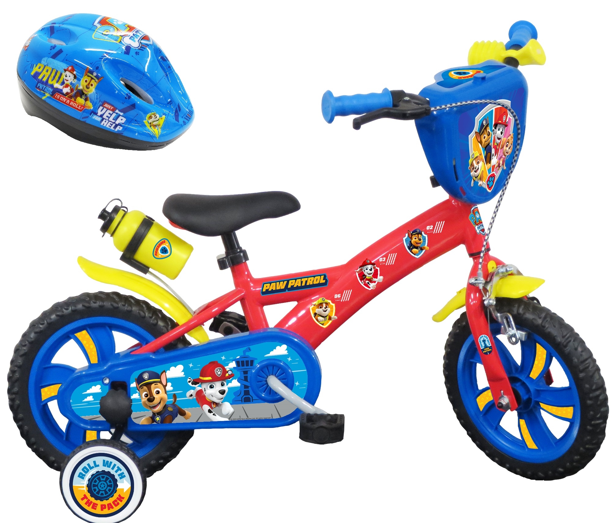 Libellé Vélo enfant - Modèle 12" Pat Patrouille + Casque pour enfant de 2 à 4 ans avec stabilisateurs - 1 frein - Bidon arrière & Plaqua avant décorative