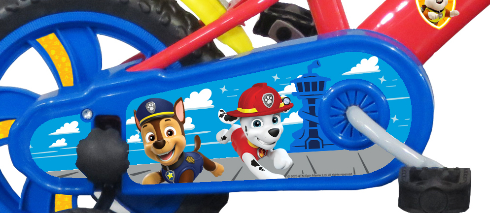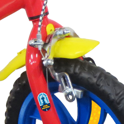Vélo 12" Garçon Licence "Pat Patrouille" + Casque pour enfant de 3 à 5 ans - Cadre Acier - Direction et pédalier en nylon - Transmission monovitesse - Pignon fixe - Frein avant Calliper - Carter de chaîne intégral - Gardes boue et poignées spécifiques pour augmenter la protection de l'enfant - Roues bâtons - Pneus EVA increvables - Stabilisateurs (montage sans outil) - Plaque décorative avant - Porte bidon - Gourde - Avertisseur sonore