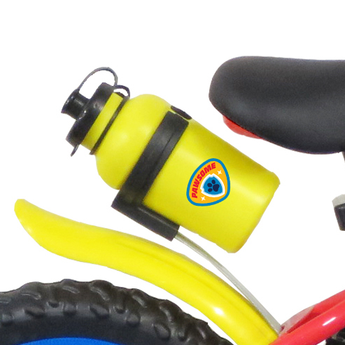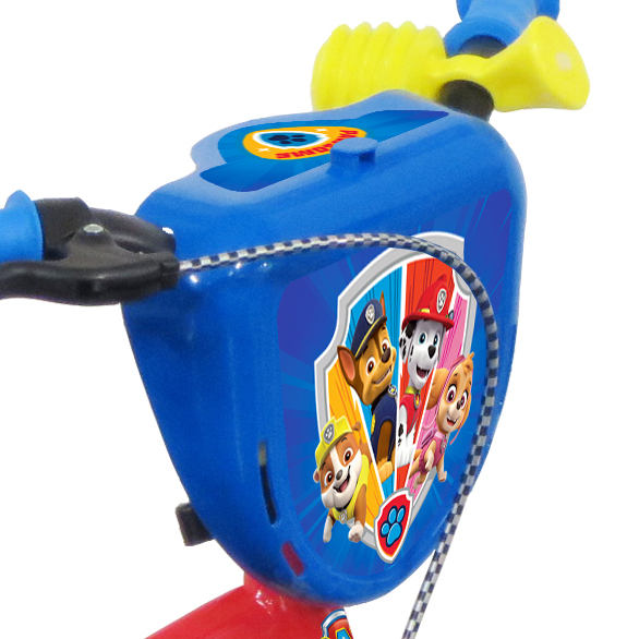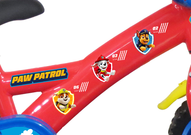 Vélo 12" Garçon Licence "Pat Patrouille" pour enfant de 3 à 5 ans - Cadre Acier - Direction et pédalier en nylon - Transmission monovitesse - Pignon fixe - Frein avant Calliper - Carter de chaîne intégral - Gardes boue et poignées spécifiques pour augmenter la protection de l'enfant - Roues bâtons - Pneus EVA increvables - Stabilisateurs (montage sans outil) - Plaque décorative avant - Porte bidon - Gourde - Avertisseur sonore