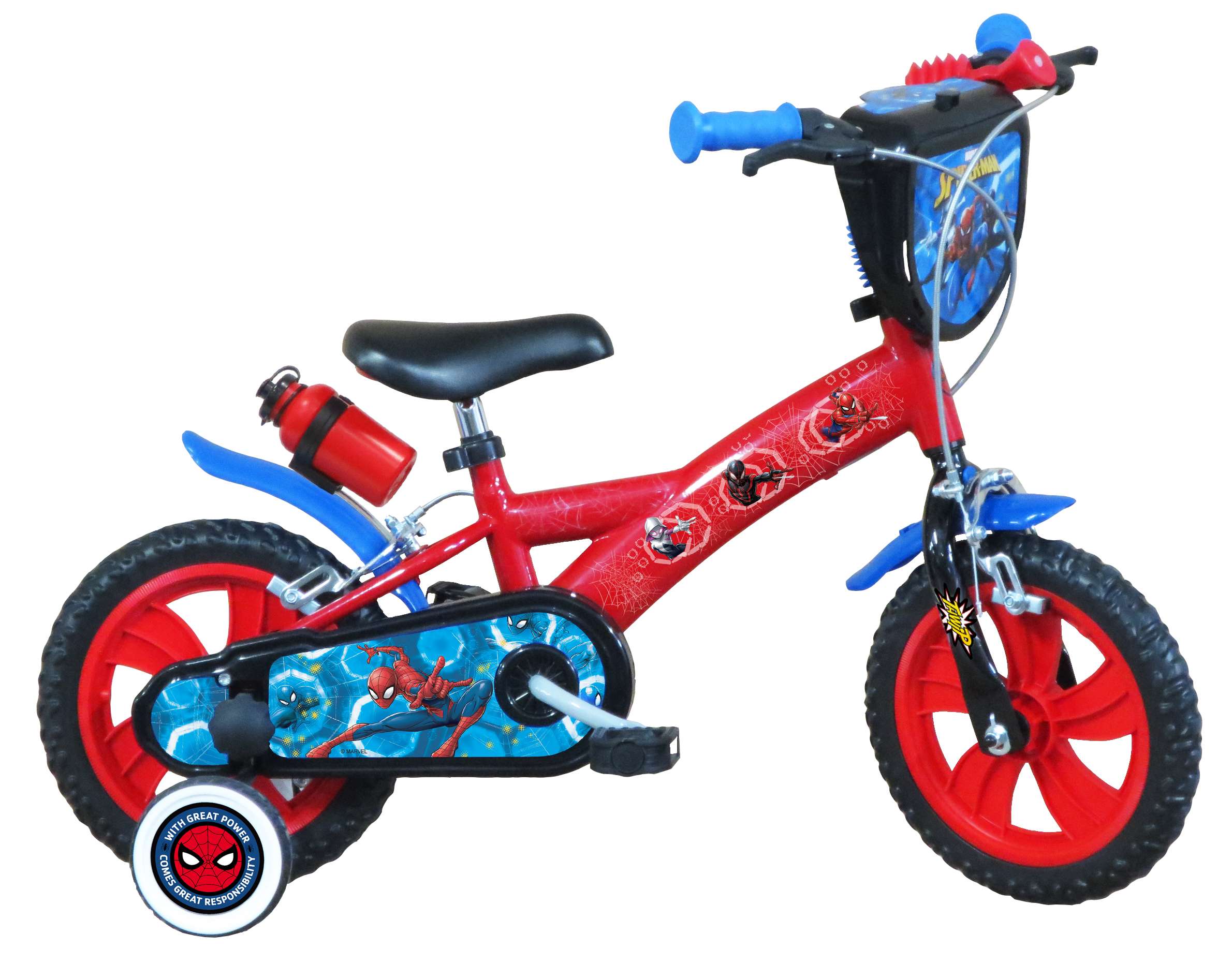 Vélo 12" Garçon Licence "Spiderman" pour enfant de 3 à 5 ans - Cadre Acier - Direction et pédalier en nylon - Transmission monovitesse - Pignon fixe - Freins avant et arrière Calliper - Carter de chaîne intégral - Gardes boue et poignées spécifiques pour augmenter la protection de l'enfant - Roues bâtons - Pneus EVA increvables - Stabilisateurs (montage sans outil) - Plaque décorative avant - Porte bidon - Gourde - Avertisseur sonore