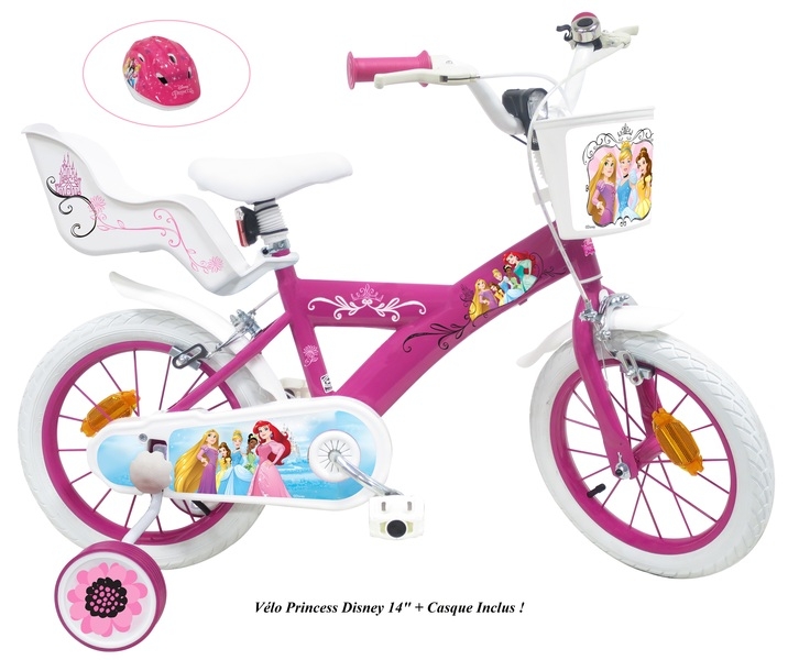 | Libellé | Vélo enfant - Modèle 14" Princesse de Disney + casque pour enfant de 4 à 6 ans avec stabilisateurs à molettes - Porte poupée - Panier avant - 2 frein |