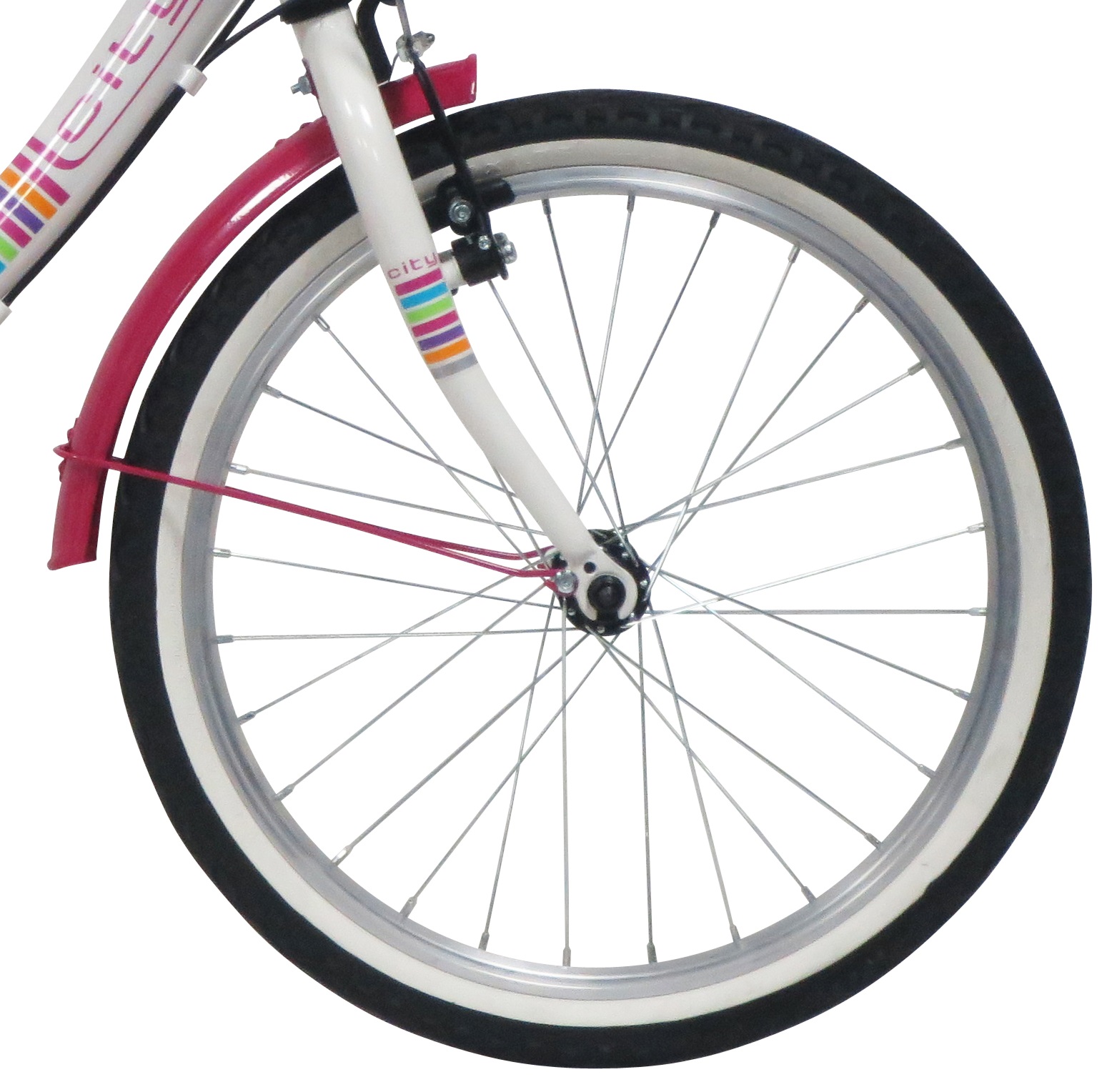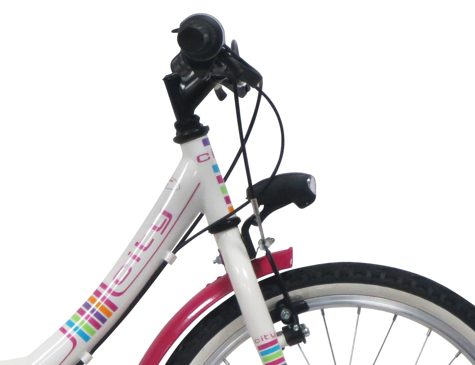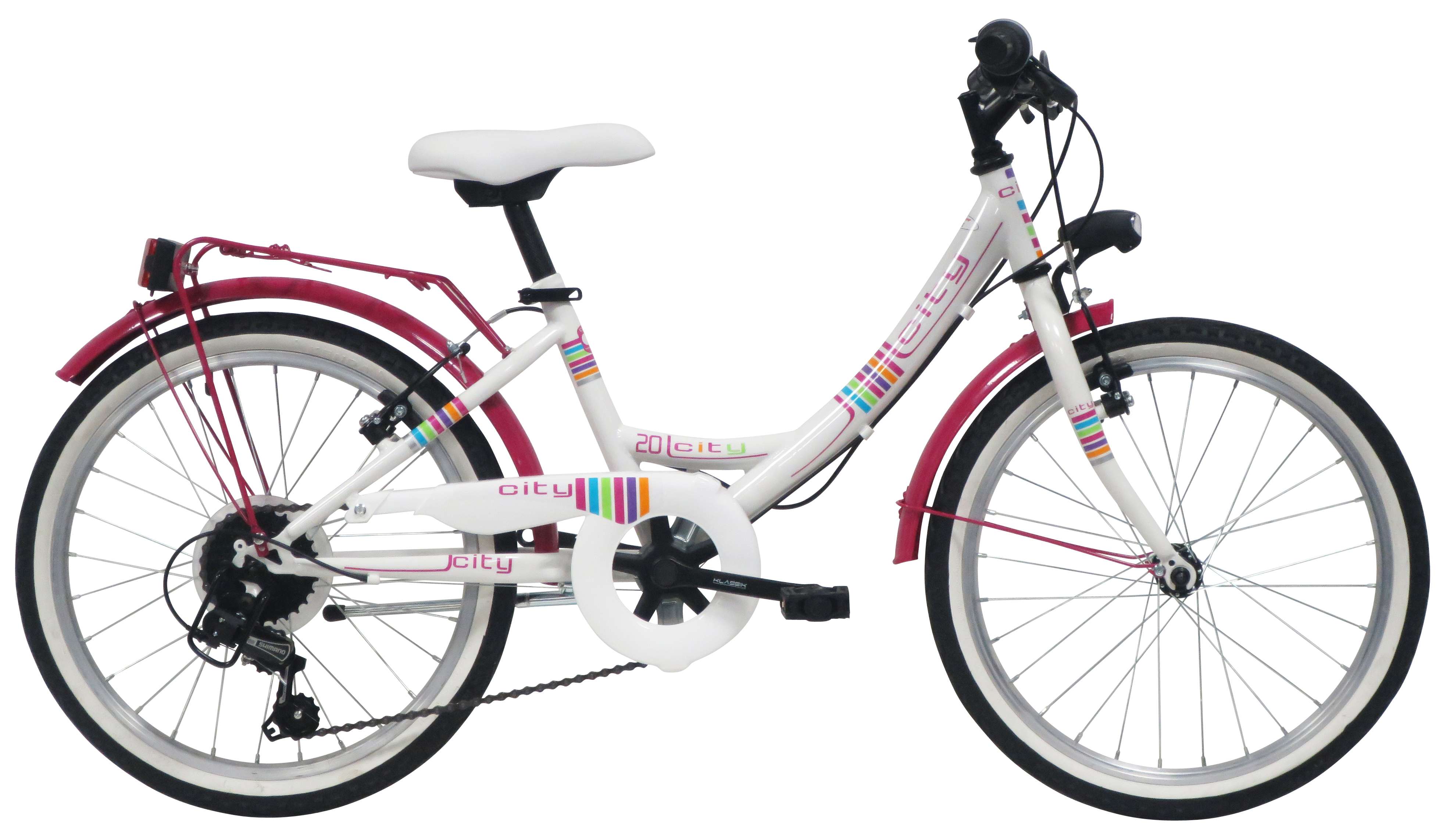 Vélo enfant VTC 20" "City" Fille - Cadre acier avec enjambement bas - Fourche rigide - 6 Vitesses par poignée tournante - Roue libre 6 vitesses - Dérailleur arrière Shimano TY21 - Potence plongeur - Freins V-Brake avec étriers acier & Leviers résine - Jantes aluminium & pneus noirs et blancs - Selle avec attache rapide - Gardes boue - Porte bagages - Béquille - Sonnette - Eclairage à piles fournies - livré monté à 98%