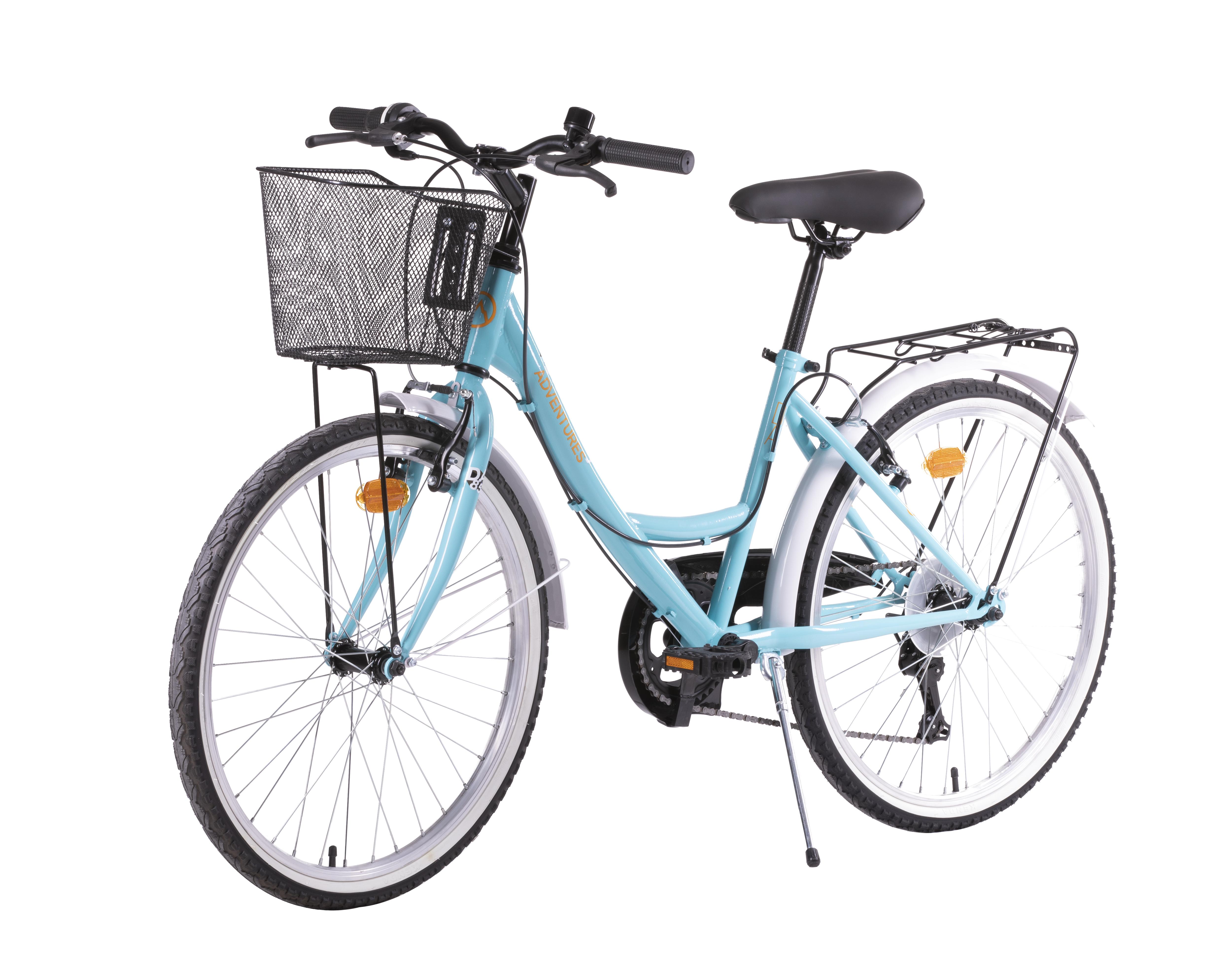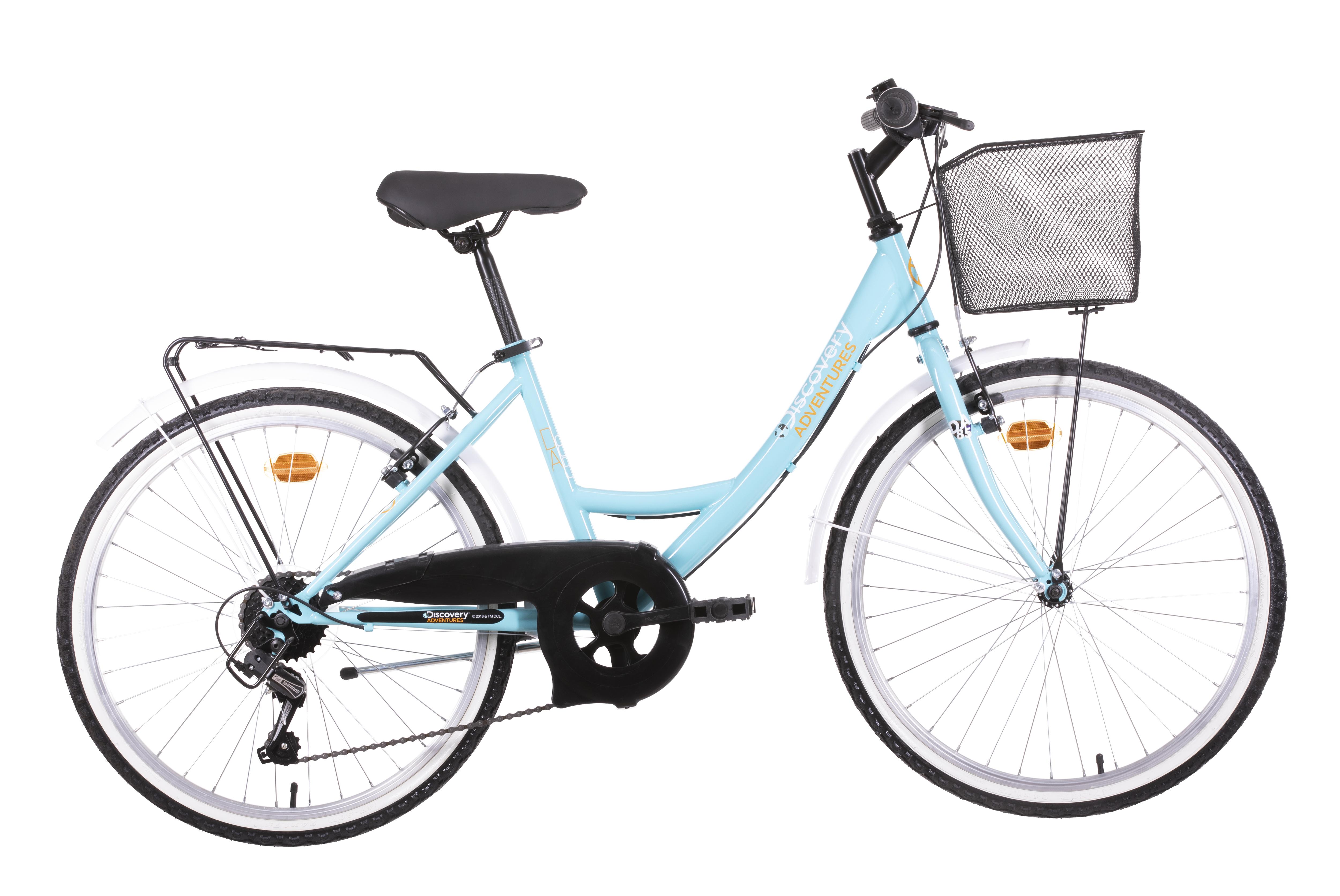 VTC 24" Fille "Discovery Adventures" - Cadre acier rigide avec enjambement bas - Fourche rigide - 6 vitesses indexées par poignée tournante - Roue libre 6 vitesses - Dérailleur arrière Shimano TY21 - Freins avant et arrière V-brake avec étriers acier & Leviers en résine - Potence plongeur - Jantes aluminium & pneus noir et blanc- Panier avant - Gardes boue - Béquille - Carter - Protège dérailleur - Selle confort - Sonnette - Taille : 130 cm-150 cm