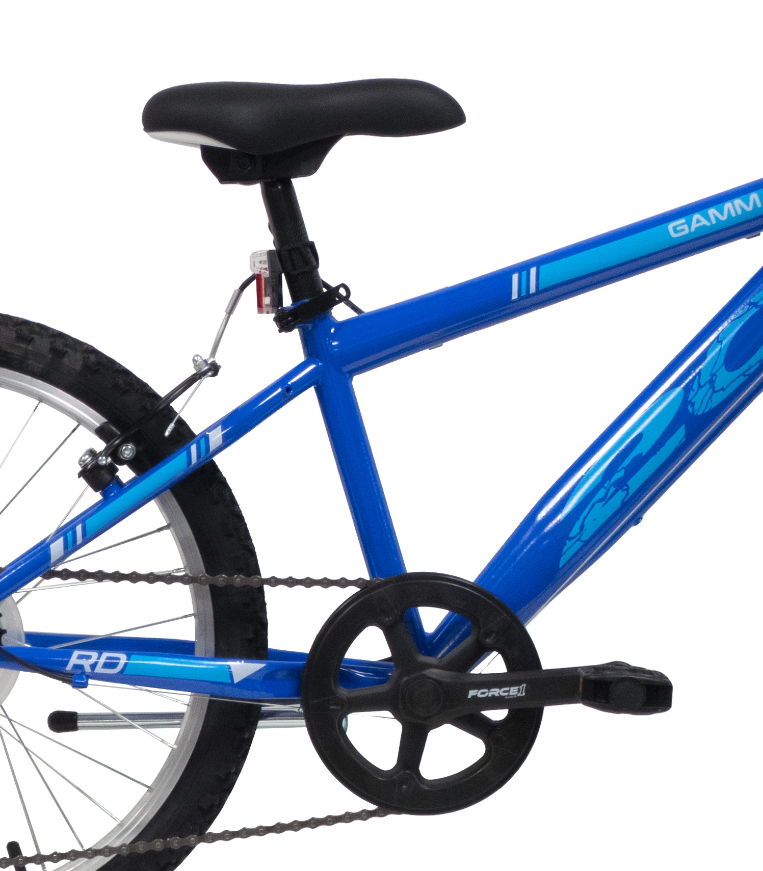 Vélo VTT 20'' Gamma rigide Garçon - Cadre acier - Fourche rigide - 6 Vitesses par poignée tournante indexée - Dérailleur arrière TY21 Shimano - Protège dérailleur - Frein avant et arrière V-brake résine noire - Jantes aluminium avec attache rapide avant & pneus noirs - Béquille - Sonnette - Eclairage LED à piles fournies