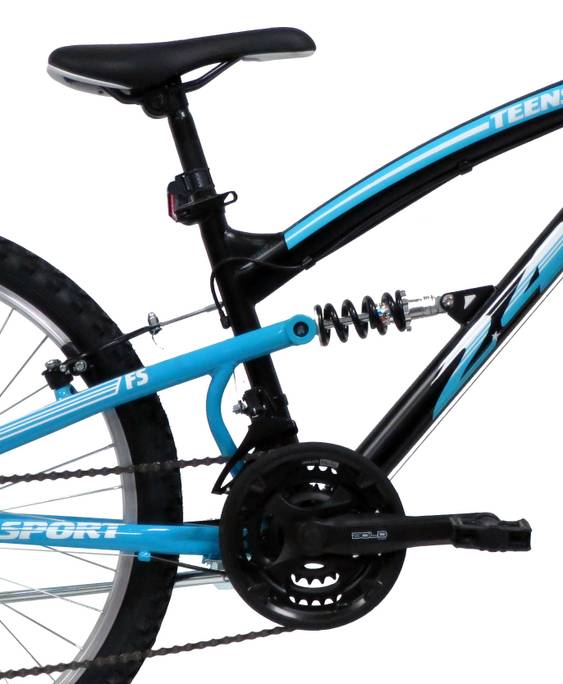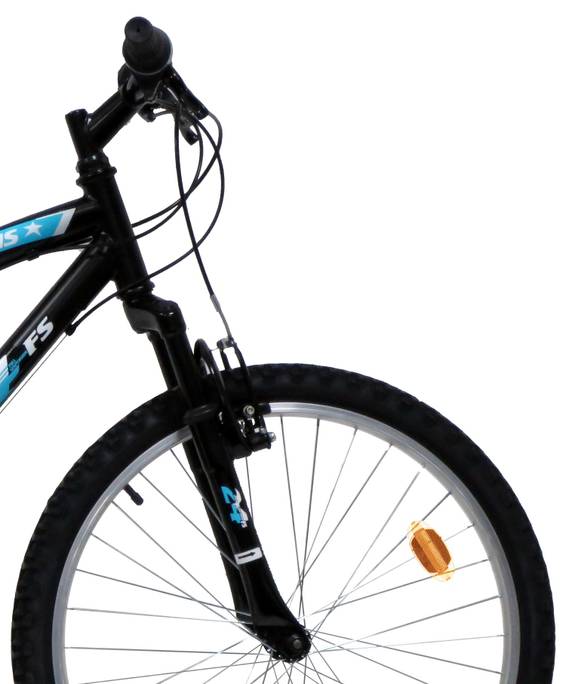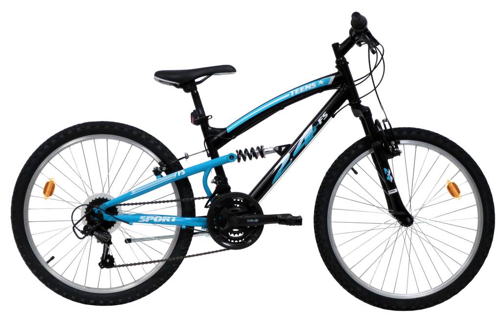 Vélo pour adolescent de taille idéalement comprise entre 1.35 et 1.60m - VTT 24'' tout suspendu "FREERIDER" - Cadre acier avec suspension centrale - Fourche télescopique - 18 Vitesses par poignées tournantes - Roue libre 6 vitesses - Dérailleur arrière Shimano TY21 - Potence plongeur - Frein avant et arrière V-brake acier & Leviers en Alu noir - Jantes aluminium avec attache rapide avant - Pneus noirs - Selle avec blocage rapide - Sonnette - Eclairage à piles fournies & marquage cycles ICA BIKE inclus !